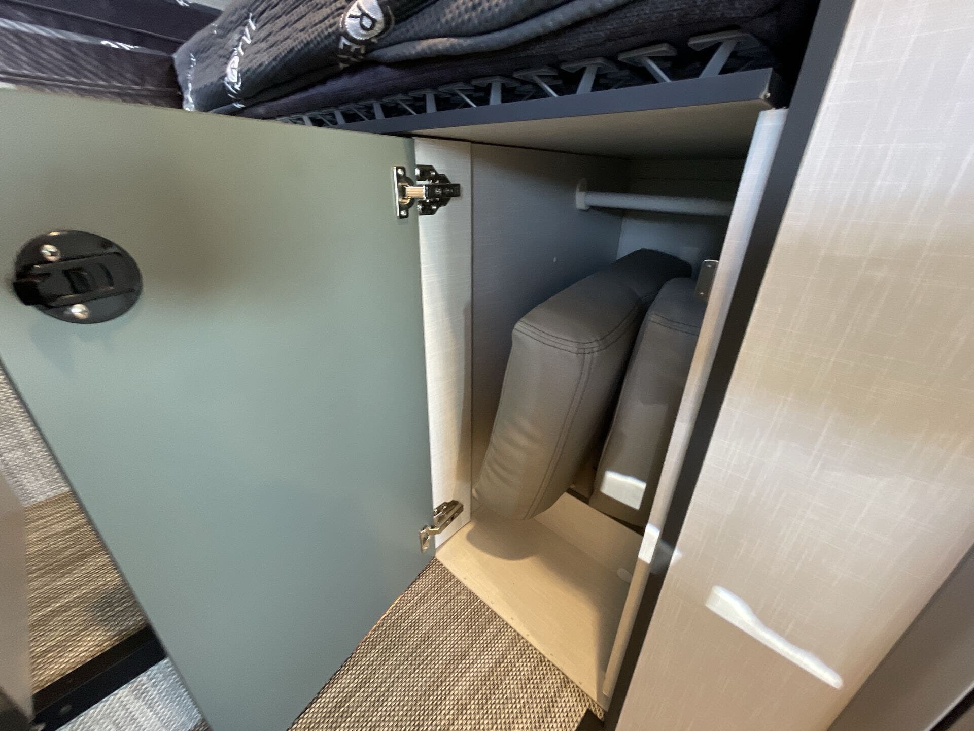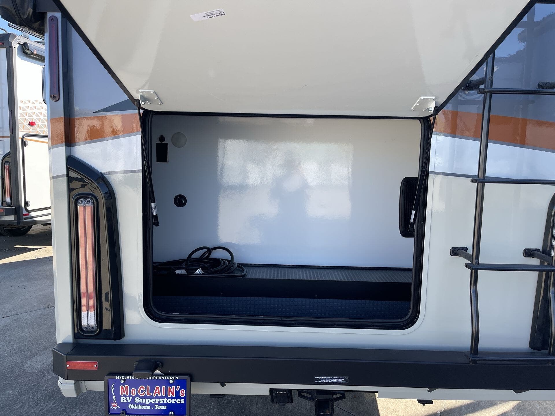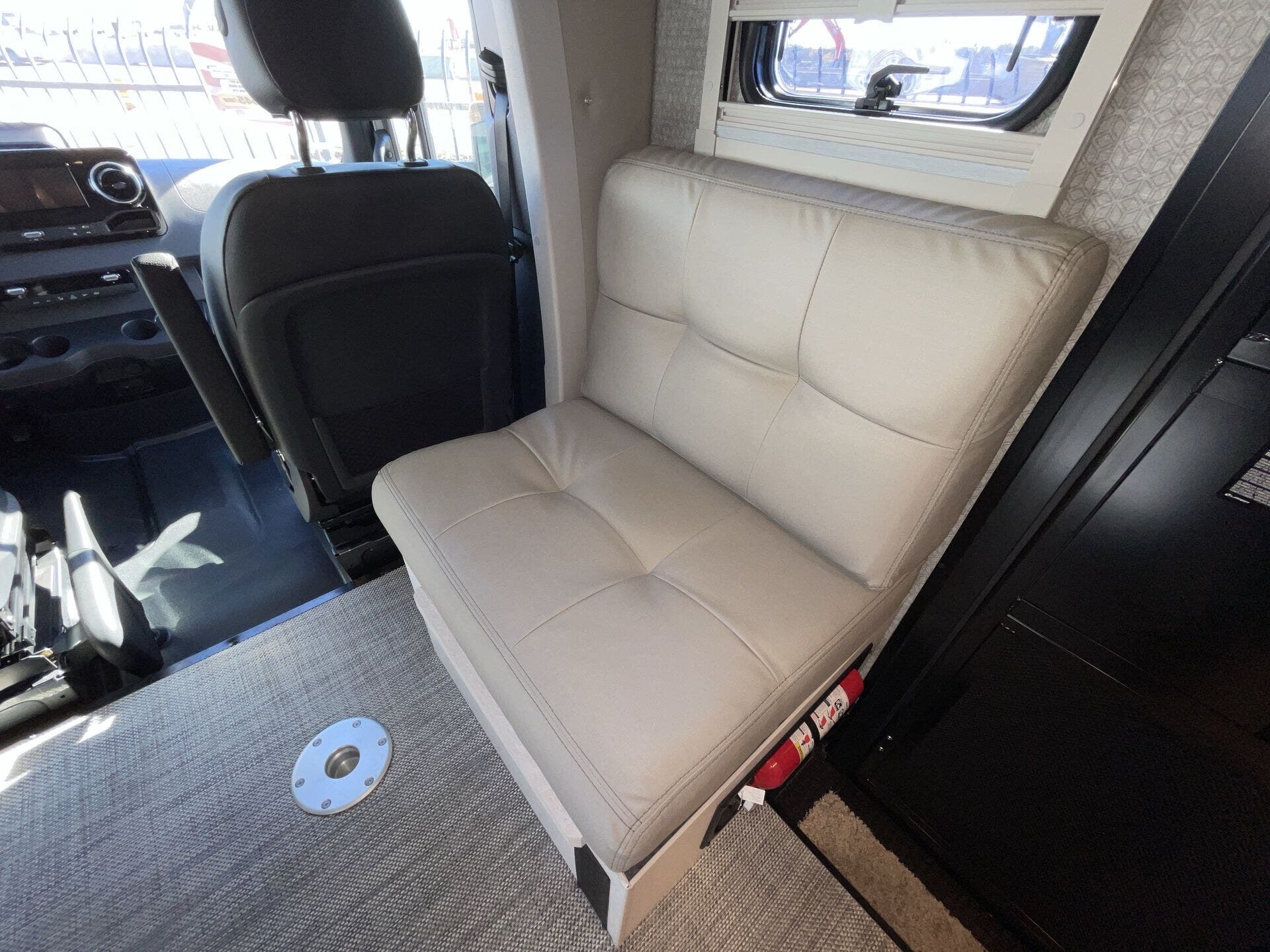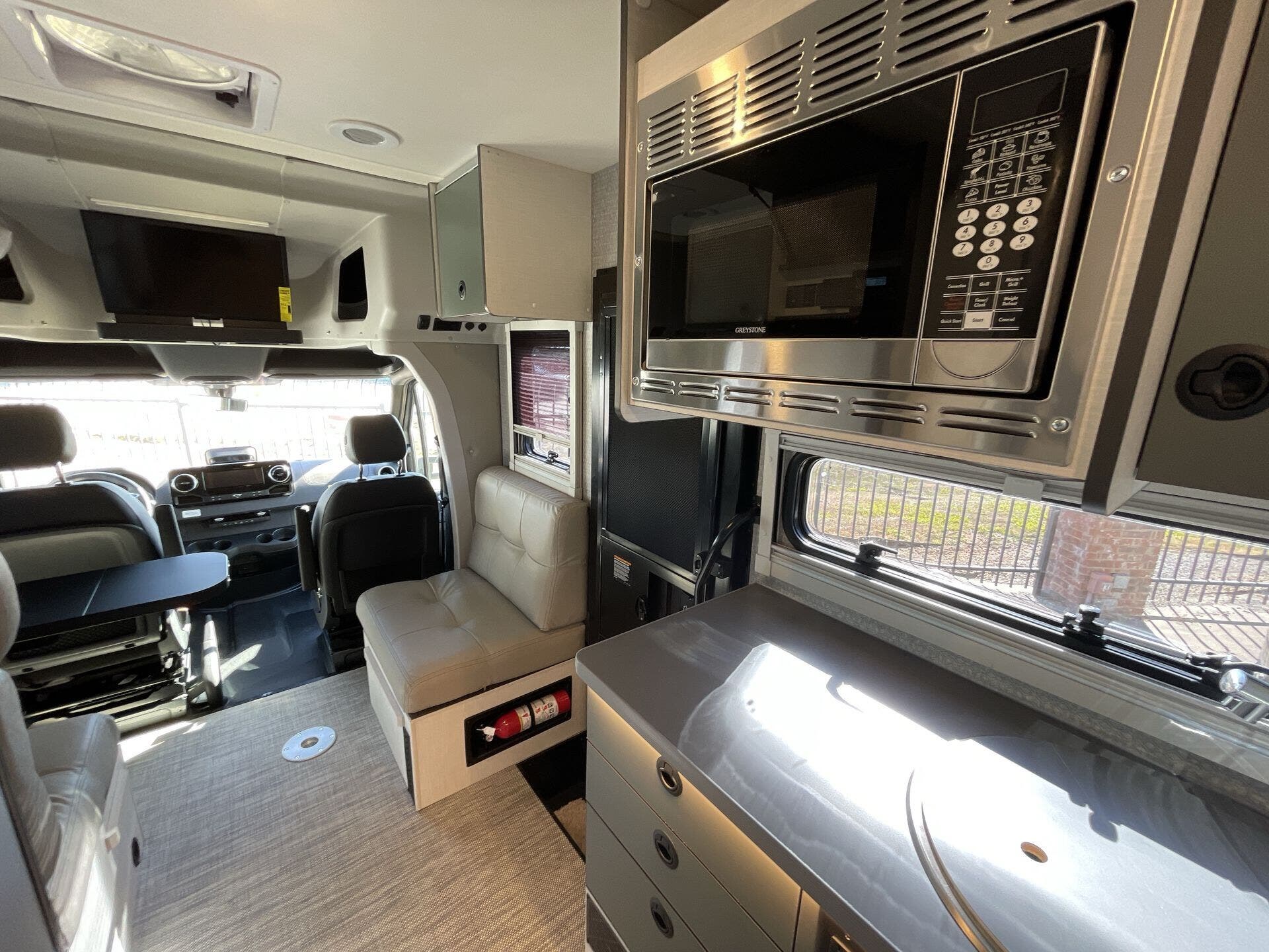 Inside, the Ekko 23B features a smart, versatile layout that maximizes every inch of space. Twin beds convert into a larger sleeping area, while the front lounge provides a comfortable place to dine, relax, or plan the next day’s route. The modern galley is fully equipped with quality appliances, ample storage, and efficient design, making meal prep easy whether you’re plugged in or off the grid. Premium materials, LED lighting, and contemporary styling give the interior a polished, upscale feel.