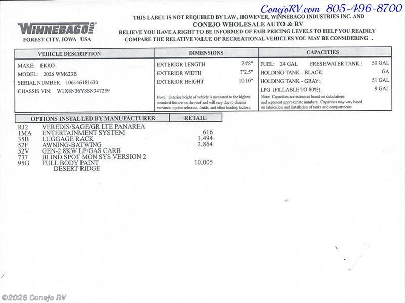 Request More Info on this 2026 Winnebago Ekko 23B Offered for sale by Conejo RV