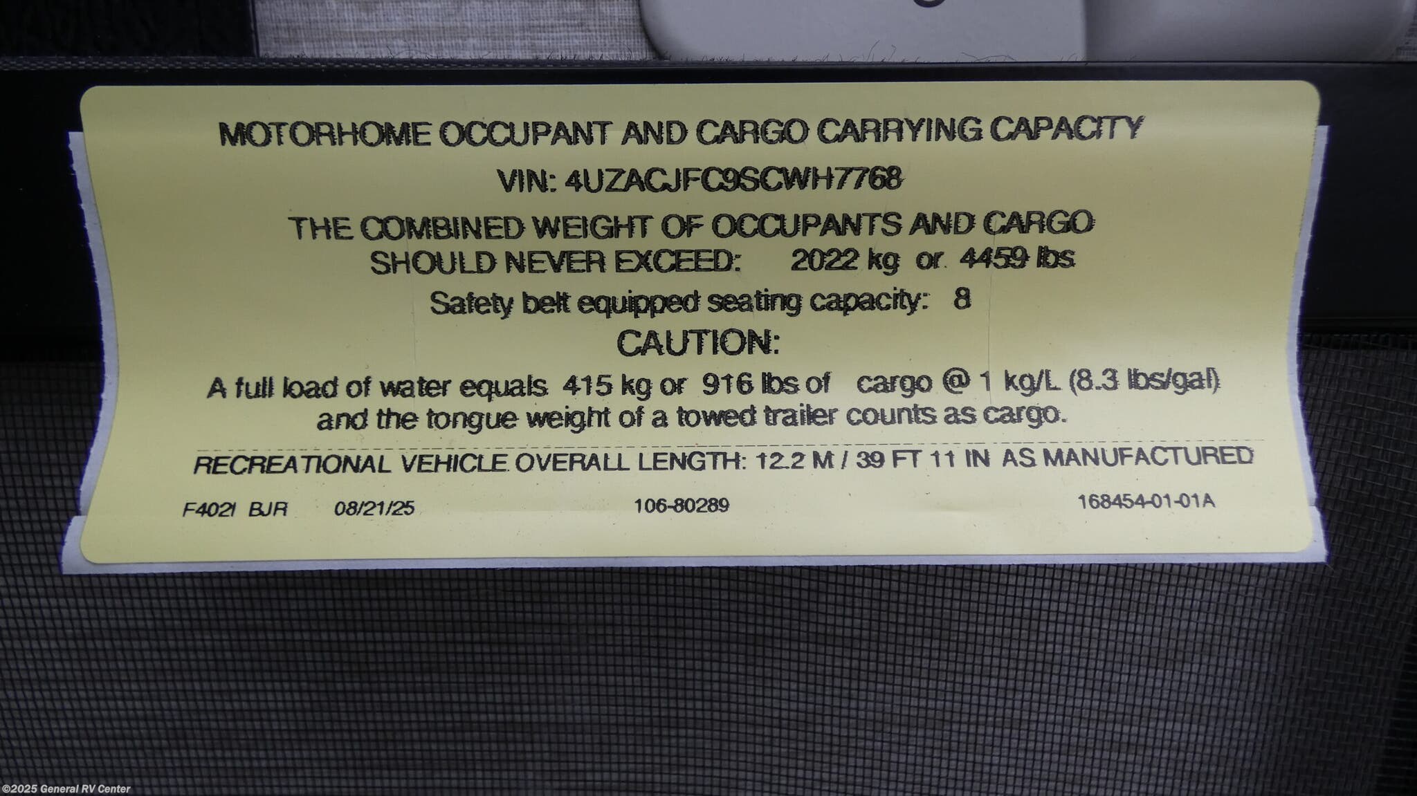 Step into the 2026 Winnebago Forza 38W, a marvel of modern RV design that combines luxury with practicality. This diesel pusher is built on a robust Freightliner XC-Series chassis and powered by a formidable Cummins I6 engine, delivering 340 horsepower and 700 lb-ft of torque. With a spacious interior that can comfortably sleep up to 10, this RV is perfect for family adventures or group getaways. The thoughtfully designed floorplan features a front kitchen equipped with a full-size electric refrigerator and a three-burner cooktop, making meal prep a breeze. Enjoy the convenience of convection cooking and a washer/dryer unit, ensuring all the comforts of home are at your fingertips. As you move through the center living area, you'll find ample seating and sleeping options with convertible beds and a cozy bunkhouse. The center bedroom offers a queen bed for a restful night's sleep, while the rear and center baths provide privacy and convenience with a plastic/glass shower. With three slides, the Forza 38W offers plenty of room to move and relax. Outside, a 20 ft. powered retractable awning creates the perfect space to unwind and enjoy the great outdoors. With a 100-gallon fresh water capacity and generous gray and black water tanks, this RV is ready for extended adventures. Visit your nearest General RV dealership to explore the Winnebago Forza 38W and start your journey today!