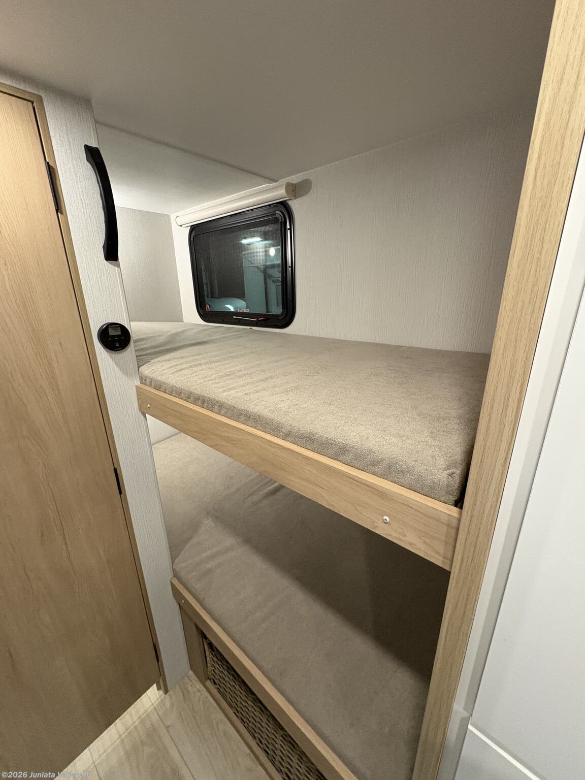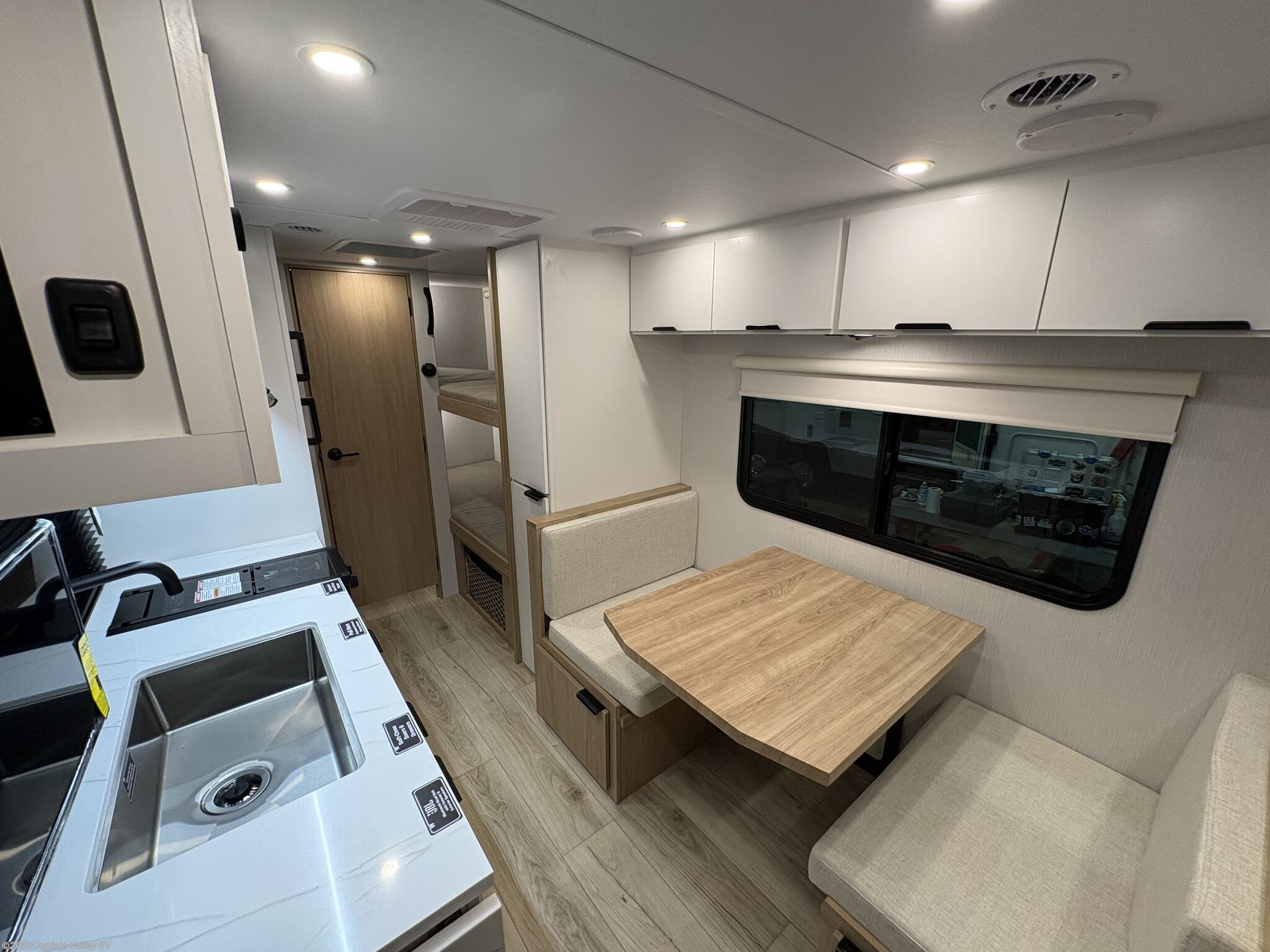 The 1800BH floorplan blends practicality with comfort. The bunk beds are ideal for kids or guests, while the front bedroom provides a private retreat. A mid kitchen keeps meal prep convenient, and the rear bath adds essential convenience on longer trips. This layout supports six sleepers and offers ample storage with pass-through and overhead cabinetry, so you can pack for extended family adventures without clutter.