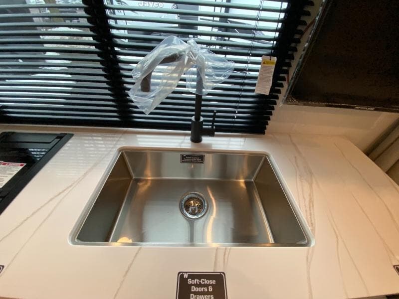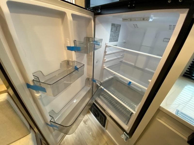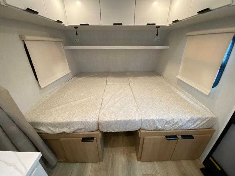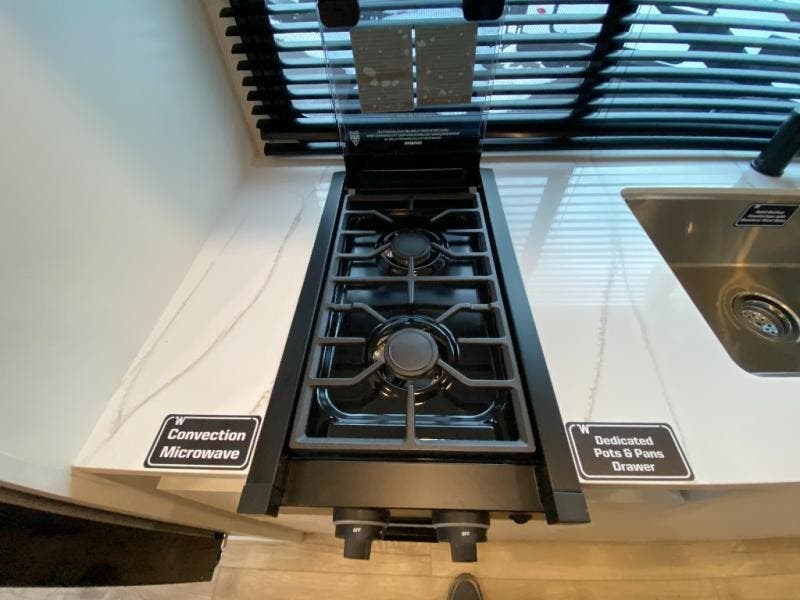 You'll love camping in this travel trailer with front twin beds and a divider curtain if you have a guest sleeping over on the booth dinette. You can whip up your best meals on the two-burner cooktop or in the convection microwave, and there is a 10-cu. ft. 12V refrigerator to keep your food fresh. A full rear bath will let you clean up after a day outdoors, and you'll appreciate the bath wardrobe/linen closet to keep clean towels and clothes close by!