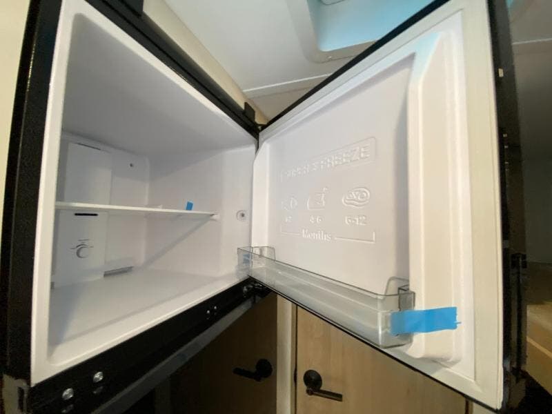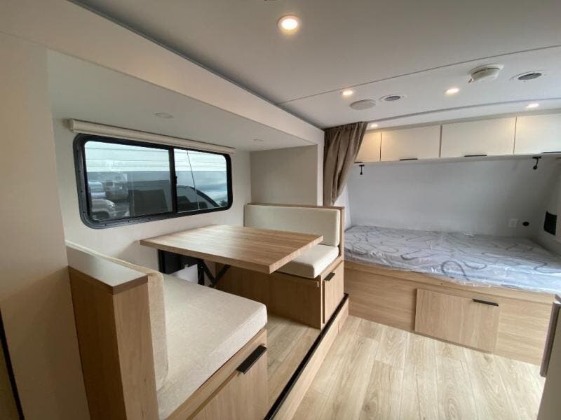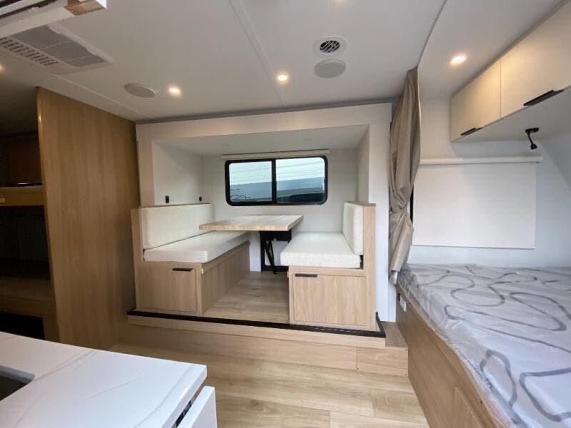 Get ready for a fun family weekend in the great outdoors with this trailer only steps away to enjoy inside comforts! The cook will love having everything to make warm meals, and can easily store leftovers in the 10.3 cu. ft. 12V refrigerator, plus the flip-up counter gives them more space to prep or dry the dishes. The front 54" x 74" full bed has a divider curtain for privacy at night and the rear corner 28" x 72" bunk beds are conveniently next to the private toilet and shower room. The booth dinette slide gives you a place to dine as well as sleep one more person, plus you will love the extra floor space that it provides. You might like to choose the EZ Glide Sofa Sleeper and table option in its place, the option is yours!