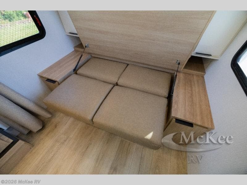 If you're looking for versatility then you need this travel trailer! Depending on the time of day you enter will determine whether you see the Murphy bed or the sofa up front. A slide out 44" x 72" booth dinette can be used for dining, playing games, and sleeping space at night. The full rear bathroom is equipped with everything you will need to freshen up each morning and features a wardrobe for your clothing and linens, and a pocket door into the bath saves space in the main room. The Smart TV is conveniently located so you can watch your favorite shows from the sofa or Murphy bed as well as the dinette, plus the pantry offers a place to store your snacks and such for easy access. The cook in your bunch will love all the amenities to make meals including the handy flip-up counter for more prep space.