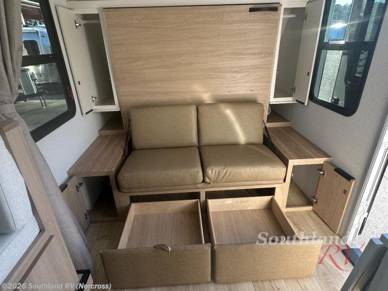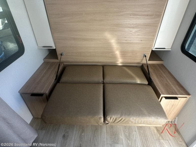 If you're looking for versatility then you need this travel trailer! Depending on the time of day you enter will determine whether you see the Murphy bed or the sofa up front. A slide out 44" x 72" booth dinette can be used for dining, playing games, and sleeping space at night. The full rear bathroom is equipped with everything you will need to freshen up each morning and features a wardrobe for your clothing and linens, and a pocket door into the bath saves space in the main room. The Smart TV is conveniently located so you can watch your favorite shows from the sofa or Murphy bed as well as the dinette, plus the pantry offers a place to store your snacks and such for easy access. The cook in your bunch will love all the amenities to make meals including the handy flip-up counter for more prep space.
