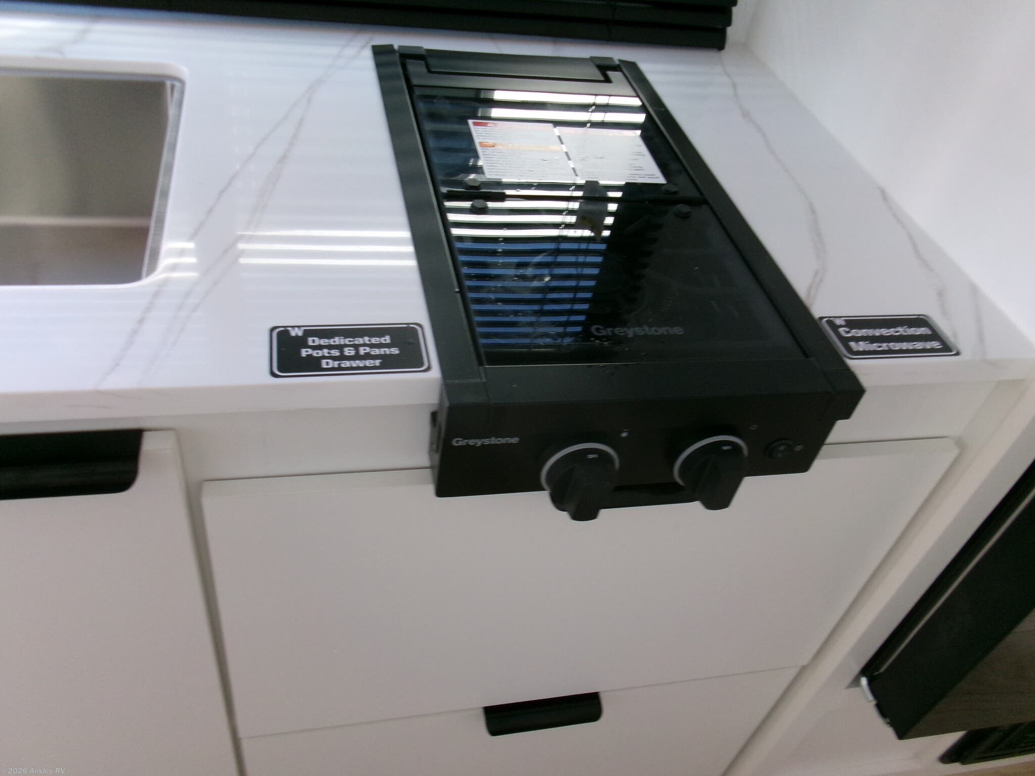 Designed for both convenience and efficiency, the open galley kitchen features a three-burner cooktop, a high-performance convection microwave, and a generously sized refrigerator to deliver the most functional galley in its class. With a spacious solid-surface counter and ample storage featuring soft-close drawers and doors, it’s designed for effortless cooking whether you're preparing quick meals or gourmet dishes on the go.