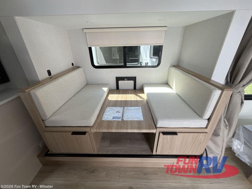Pack your bags and head to the campground with this travel trailer! You will love all that it has to offer from the full rear bathroom to the front 60" x 74" RV queen-size bed with dual wardrobes on either side of the bed. The 44" x 72" booth dinette slide is not only a great place to enjoy your meals at or play card games, but it can also be transformed into an extra sleeping space if you want to bring along a guest. When you don't feel like making dinner, you can easily pop in some leftovers or a bag of popcorn into the convection microwave and relax while you watch a movie on the Smart TV!