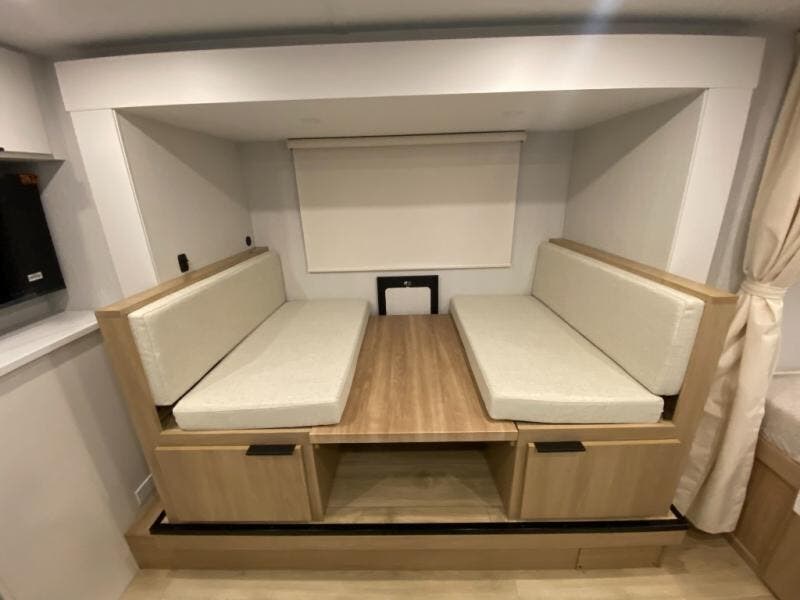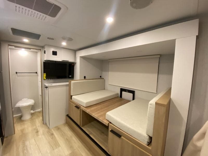Come see just how accommodating this travel trailer can be! The two 32" x 74" twin beds up front have a nightstand in between them and a divider curtain to draw, plus they can convert into one 74" x 82" king-size bed. The 44" x 72" booth dinette slide can also convert into an extra sleeping space when you're not using it for meal time or playing games. Everyone can get squeaky clean in the full rear bathroom, and the wardrobe is a convenient place to store your linens and extra clothes. Grab a snack from the kitchen pantry or pop a bag of popcorn in the convection microwave then watch a movie on the Smart TV or head outdoors and relax underneath the power awning!