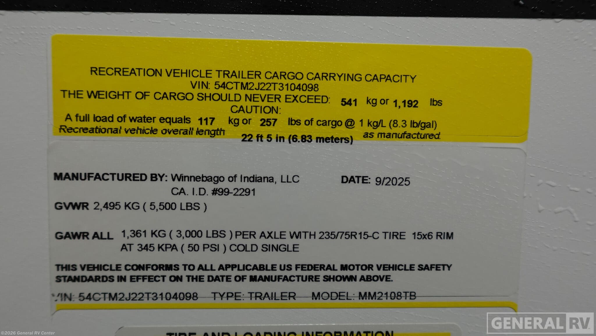2026 Winnebago Micro Minnie 2108TB Specifications