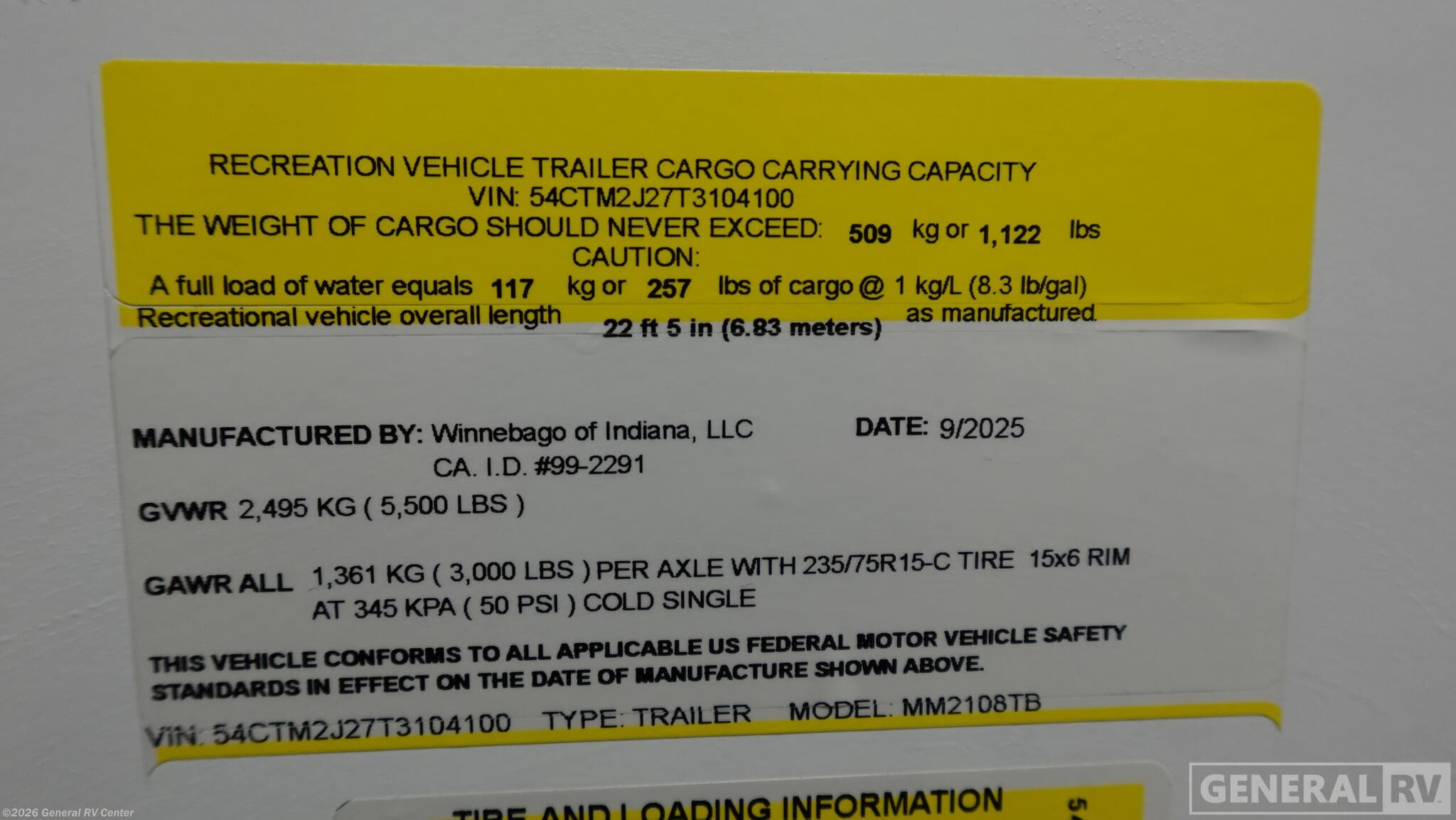 2026 Winnebago Micro Minnie 2108TB Specifications