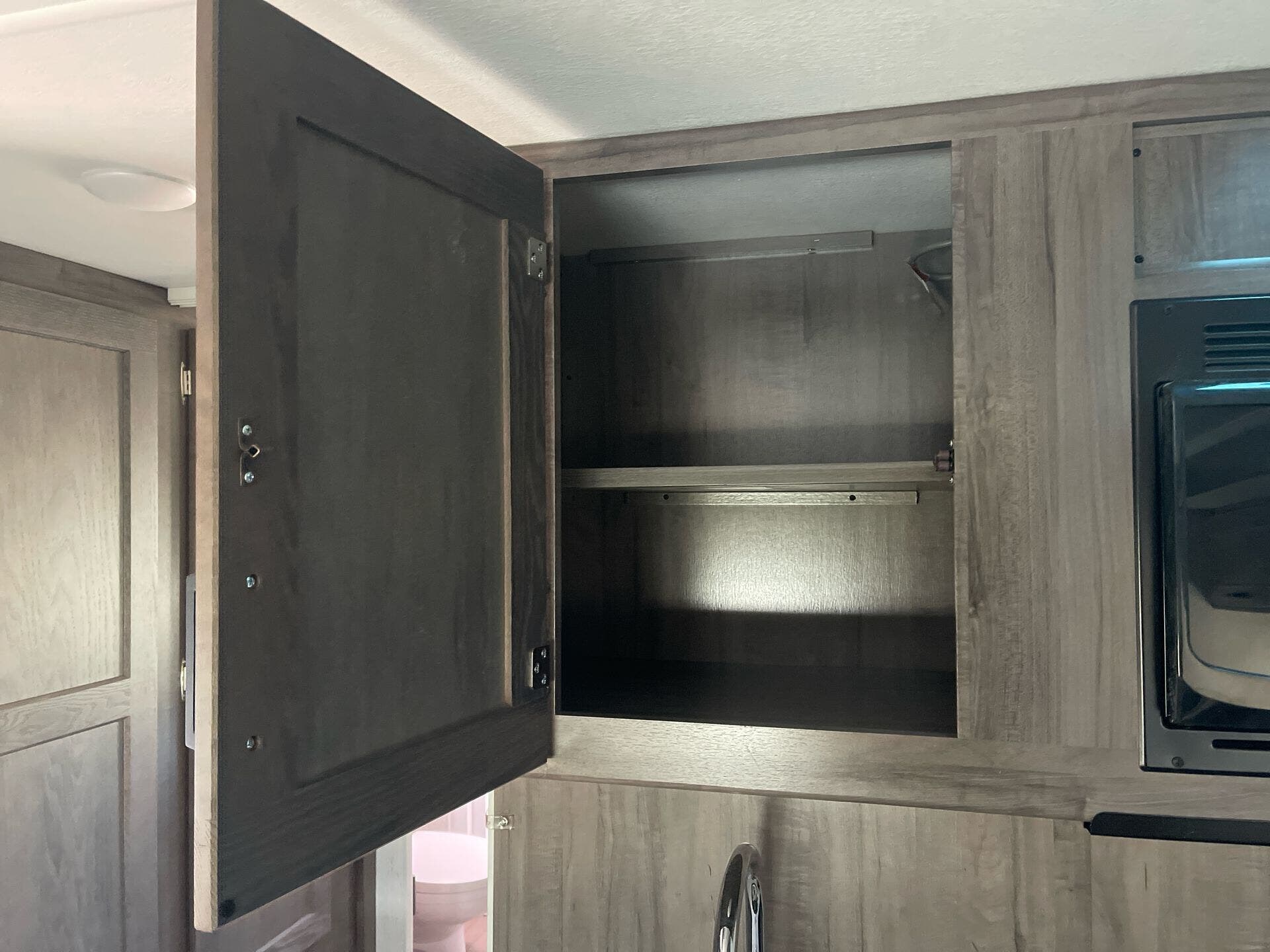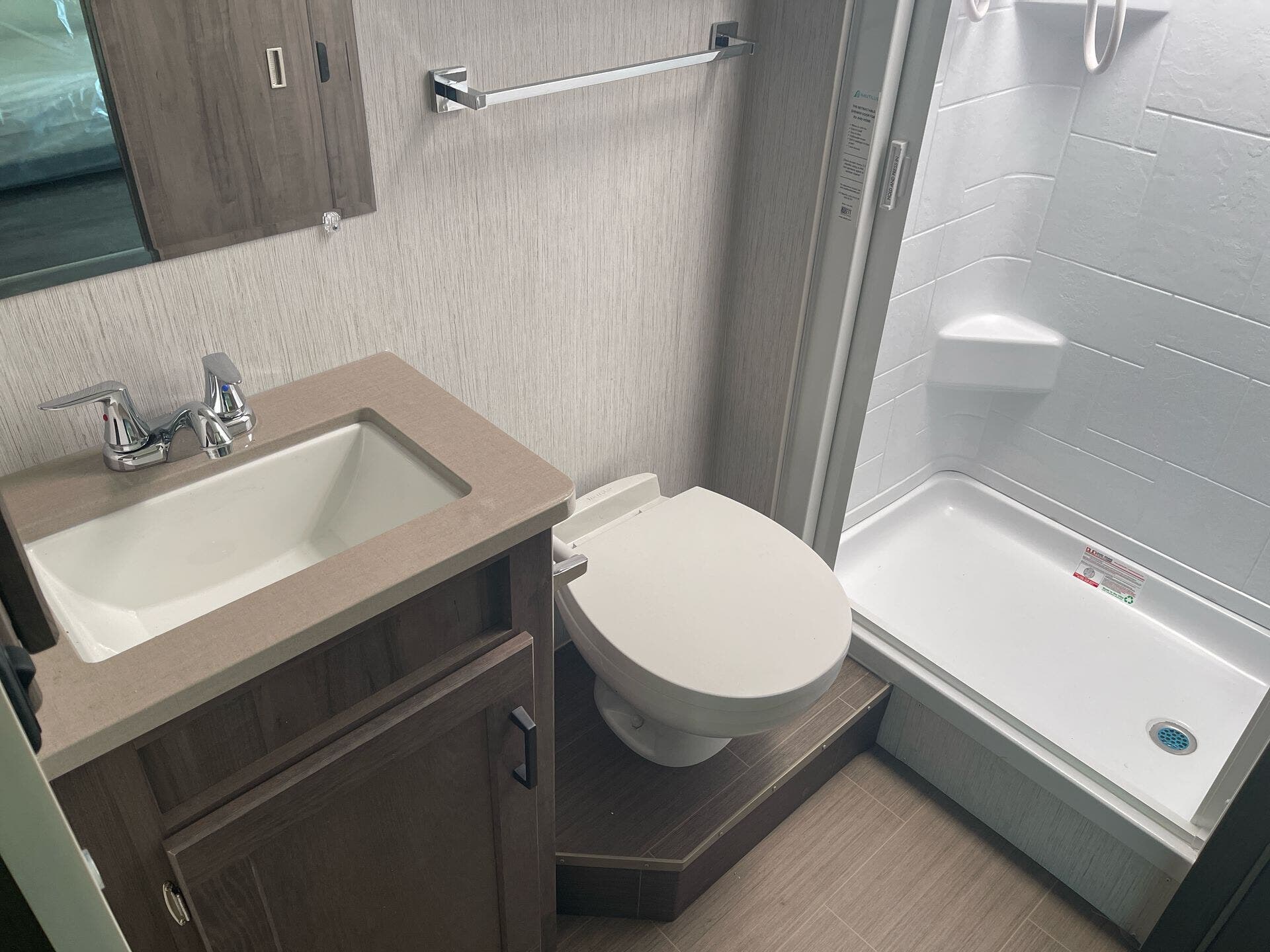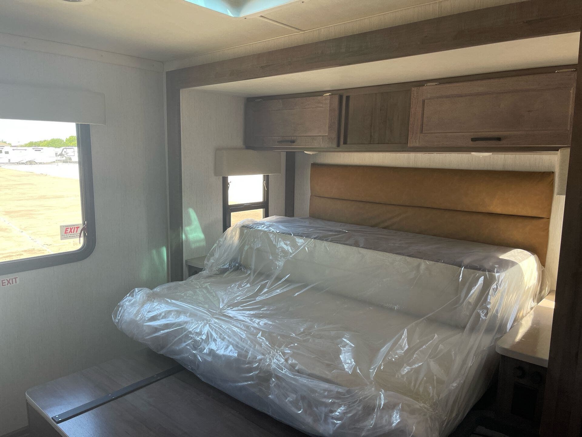 Inside, the coach offers a thoughtfully designed layout with an L-shaped galley, U-shaped dinette, and a sofa bed or optional theater seating, providing versatile living and dining options. The rear bedroom boasts a queen-size bed and ample wardrobe storage, ensuring a restful retreat. The bathroom features a shower, toilet, and sink, offering all the comforts of home.