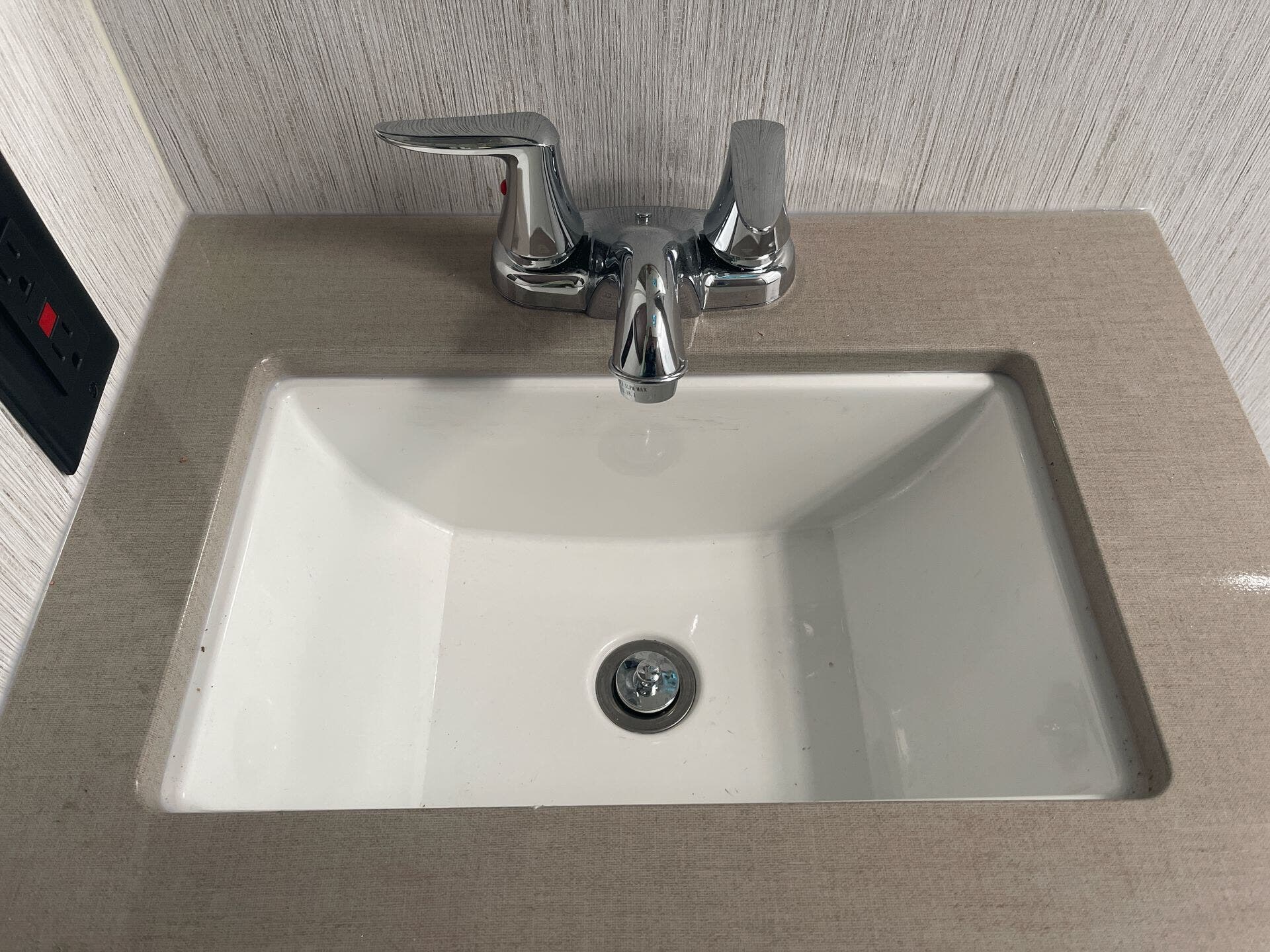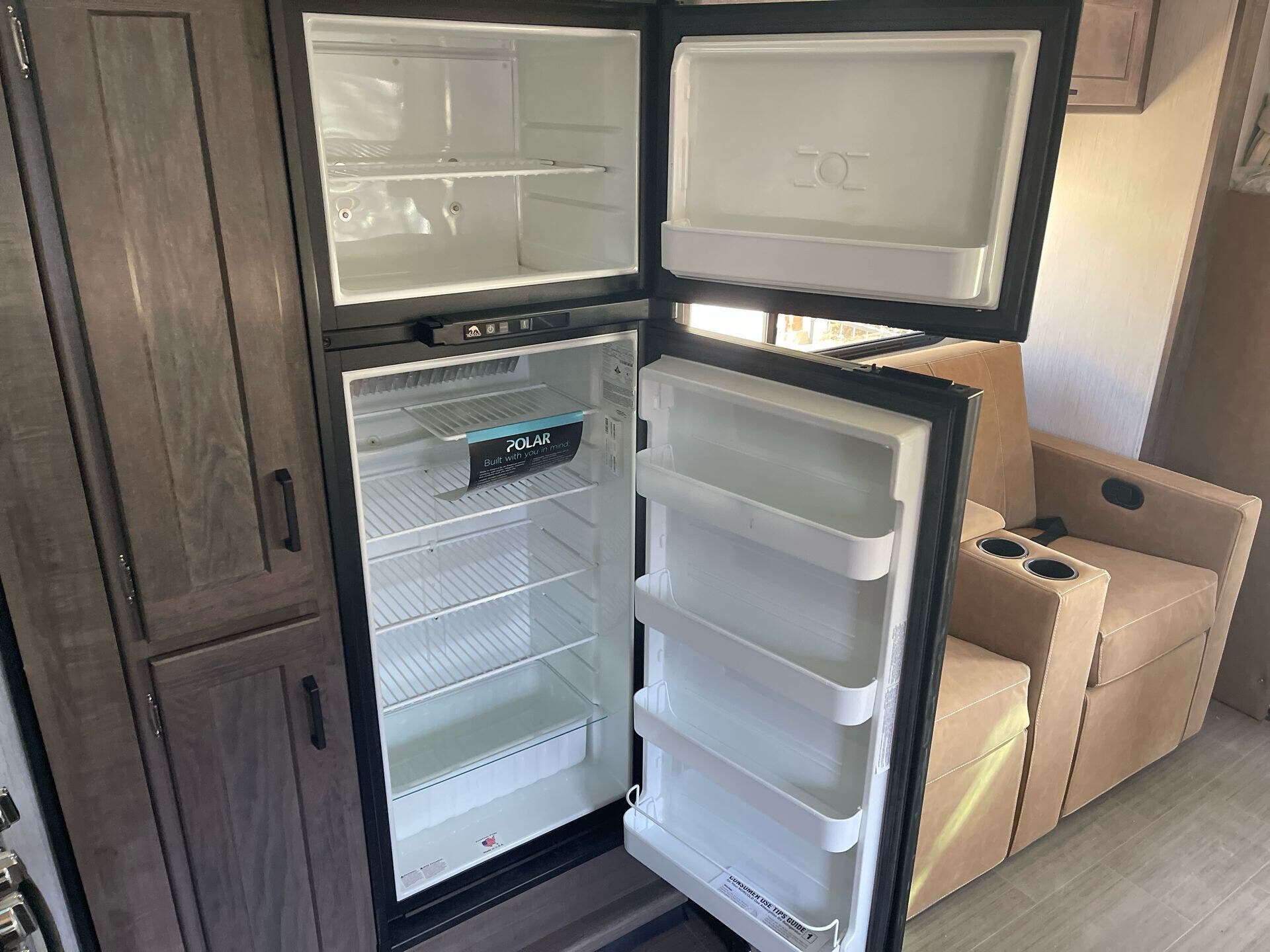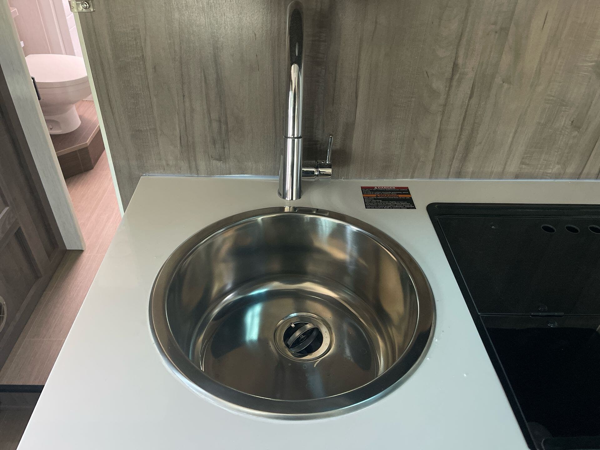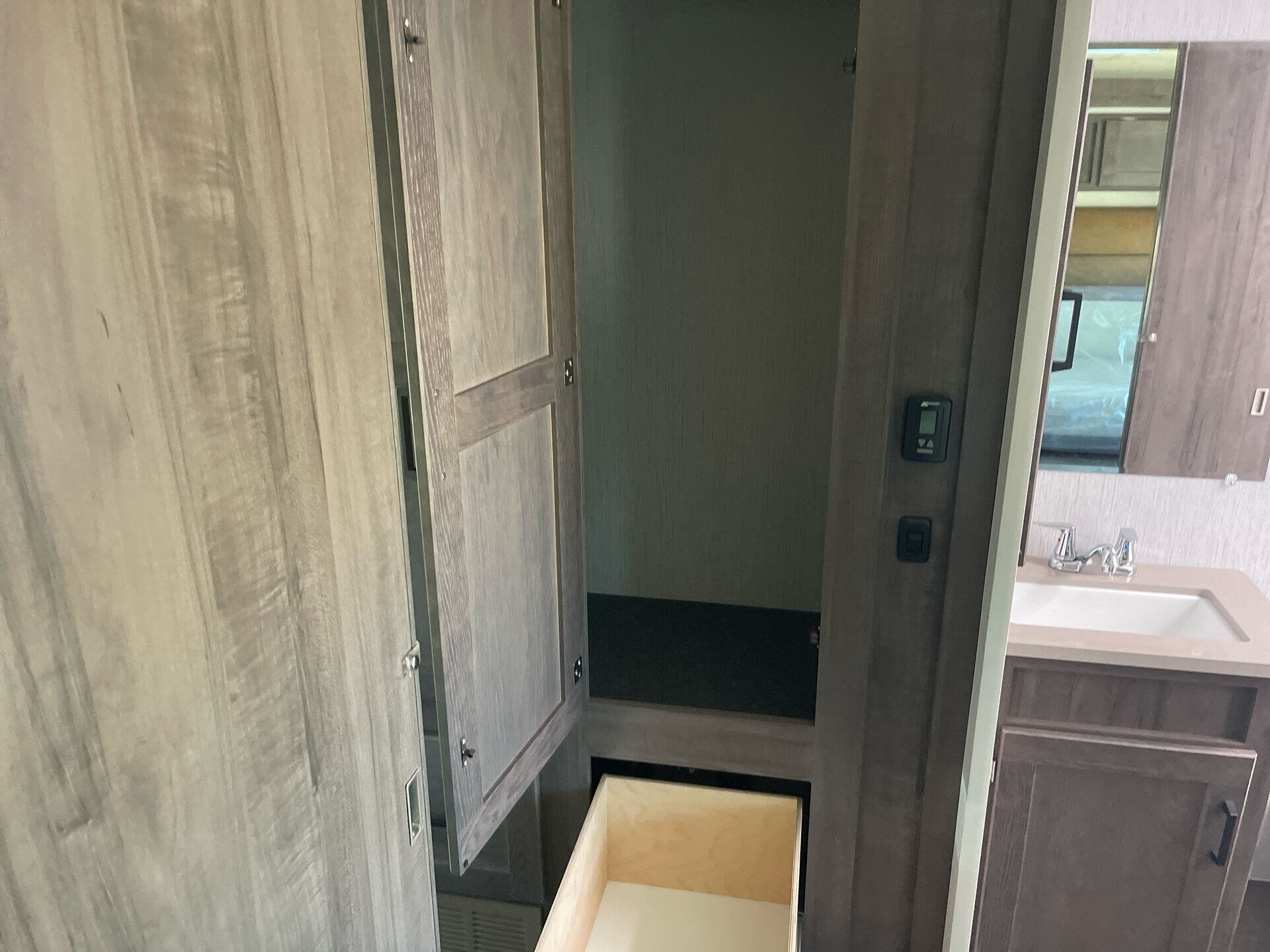 Inside, the coach offers a thoughtfully designed layout with an L-shaped galley, U-shaped dinette, and a sofa bed or optional theater seating, providing versatile living and dining options. The rear bedroom boasts a queen-size bed and ample wardrobe storage, ensuring a restful retreat. The bathroom features a shower, toilet, and sink, offering all the comforts of home.