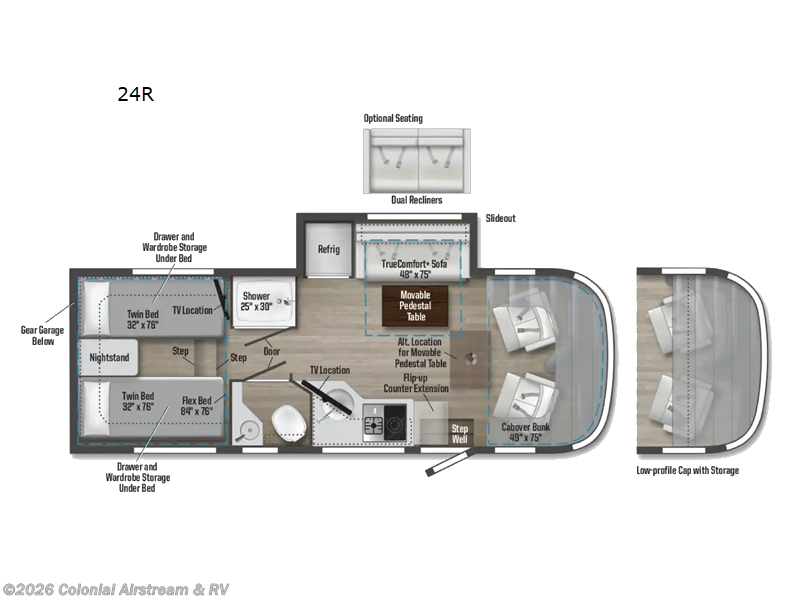This is the perfect coach to travel with your honey or hiking buddy since there are two 32" x 76" twin beds in the back that can convert to a king-size bed if you choose! And the TrueComfort+ sofa with a movable pedestal table plus the cabover bunk will provide additional sleeping space. You can choose the optional low profile front cap with storage if you do not need the added sleeping space. An optional 3800W RVMP LP generator is also available with this model. There is a 25" x 30" shower across the hall from a private toilet and sink so two people can freshen up at once. You will also be able to create meals each day since there is a two burner cooktop and convection microwave, and the 12V refrigerator will keep cold items fresh!