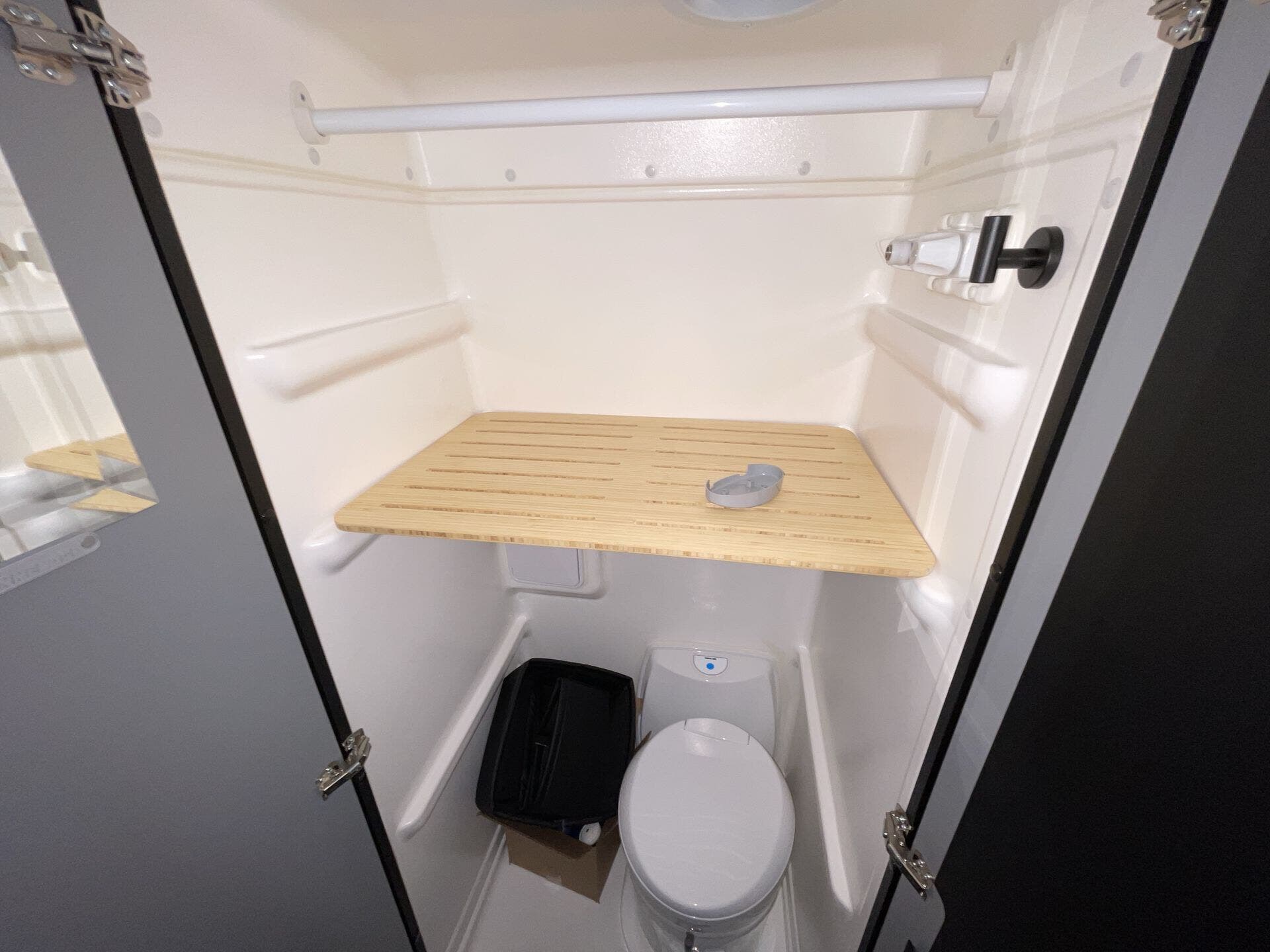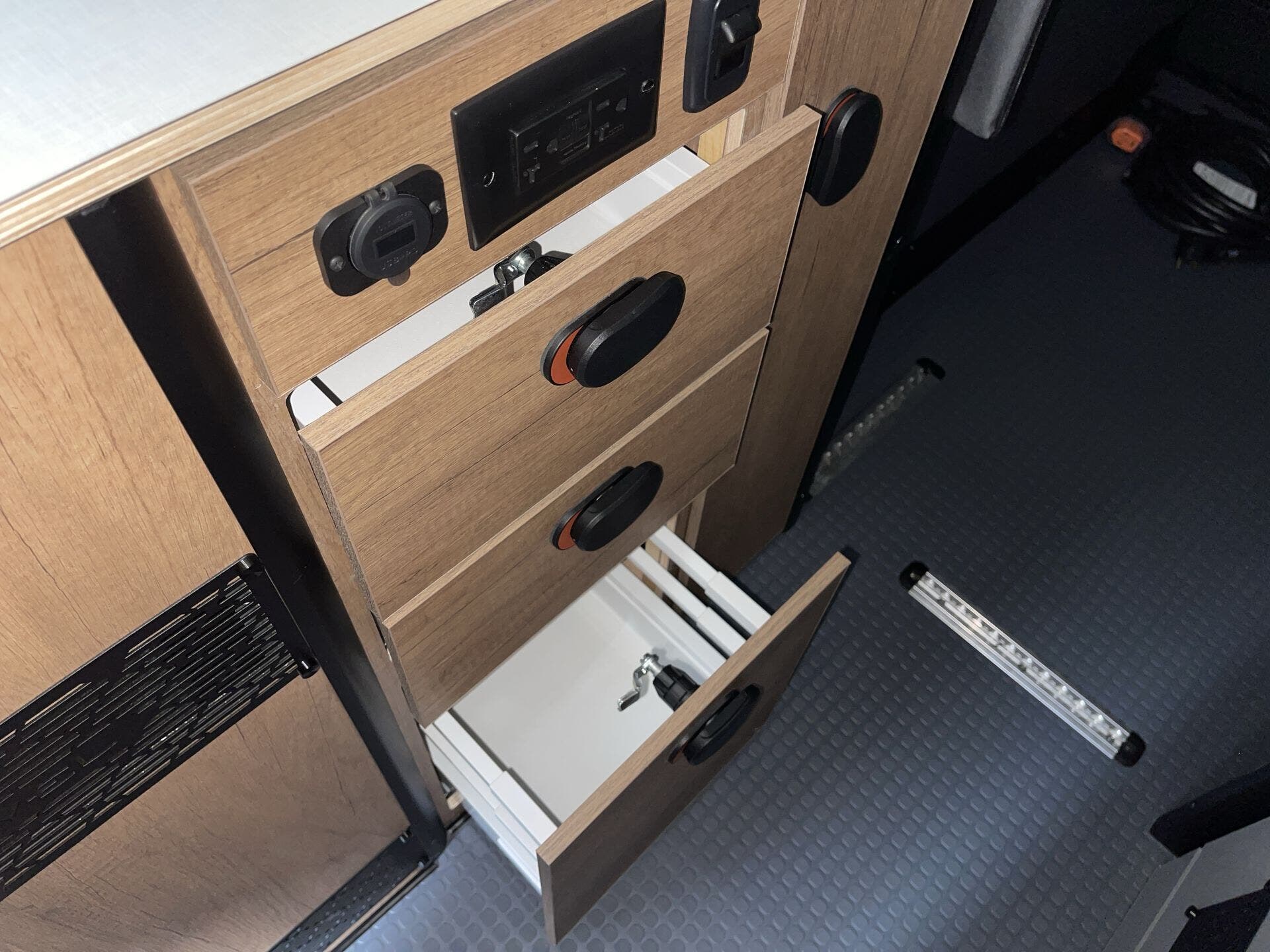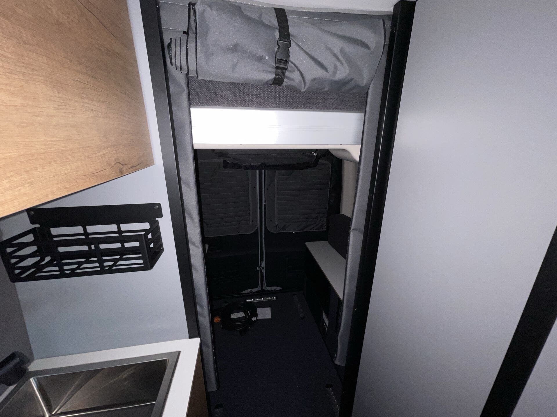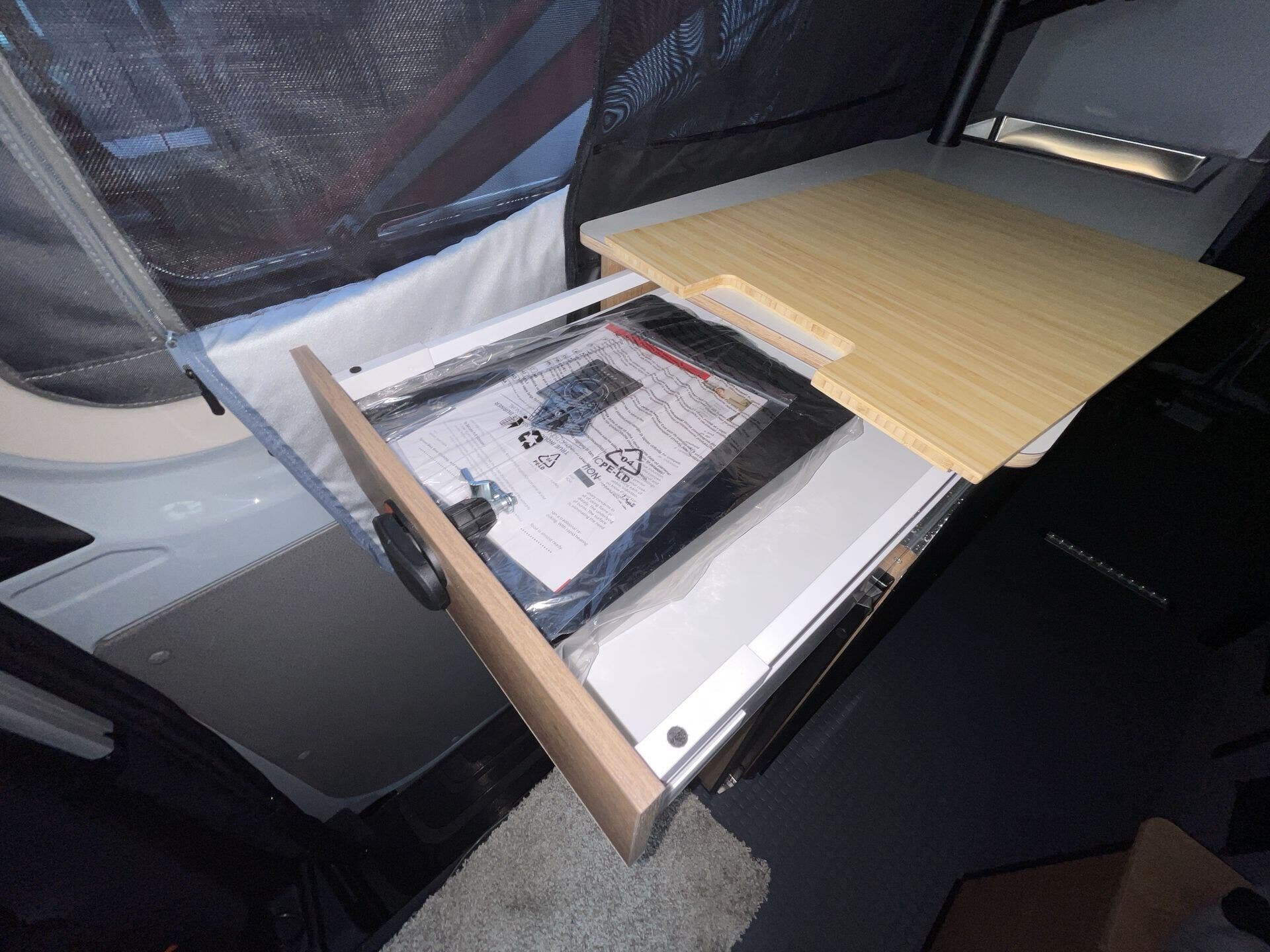 Inside, the Revel 2.5 44E maximizes space with a highly functional, flexible layout. The rear PowerLift bed transforms the garage area into additional living space or gear storage, while the kitchen features a full-size induction cooktop, refrigerator, and ample storage for easy meal prep on the road. The interior is outfitted with durable, easy-to-clean surfaces, modern cabinetry, and clever storage solutions, ensuring every inch is optimized for comfort and efficiency.