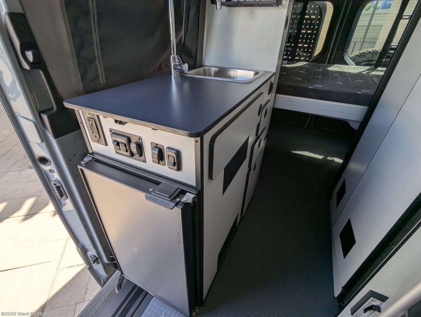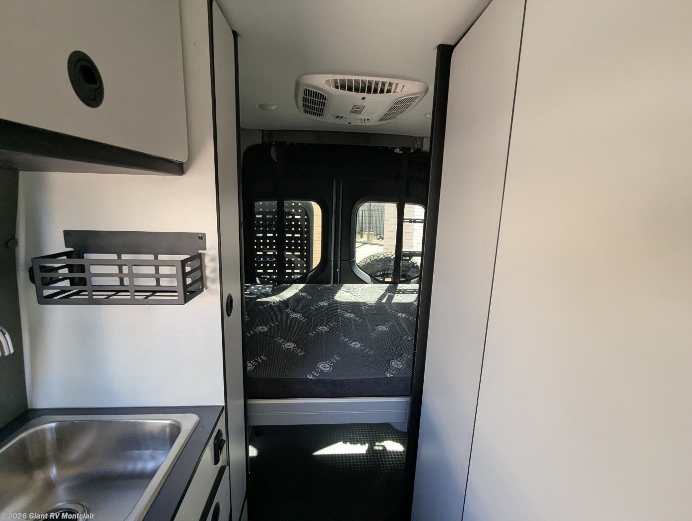 - Flexible Living & Sleeping Area with a multi-purpose lounge that easily converts into a comfortable sleeping platform — perfect for lounging by day and resting by night. The clever layout maximizes usable floor space in a van of this size.