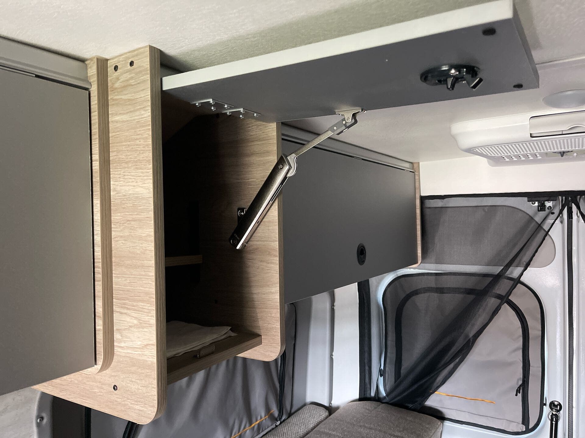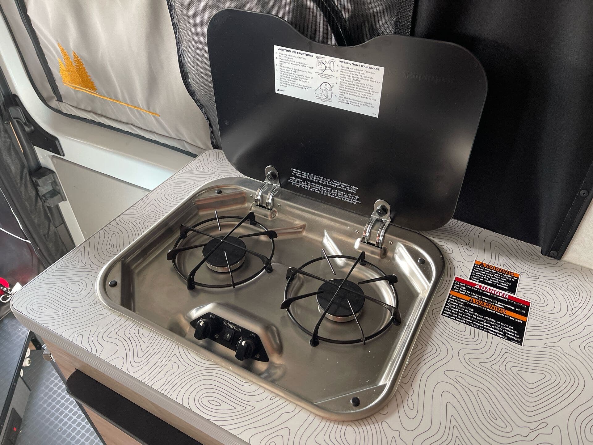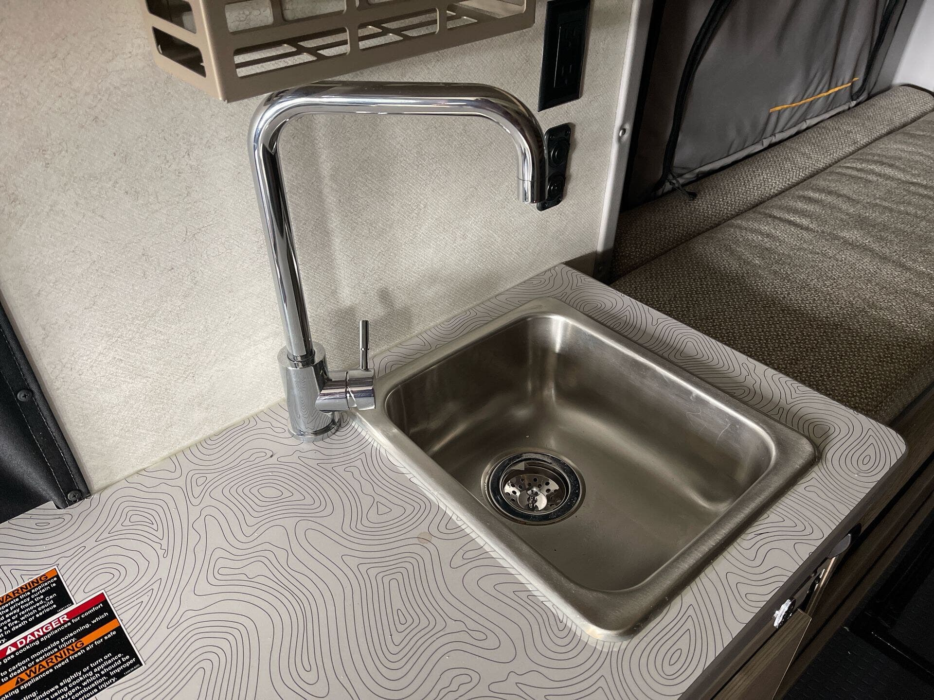 Roomy inside, the 59P sleeps four: a rear Murphy+ bed that folds into a lounge and a pop-top loft above for kids or guests. The wet bath incorporates a flexible showerhead and cassette toilet. The central galley features a two-burner stove, 3-cuft compressor fridge/freezer, stainless sink, and pull-out countertop extension.