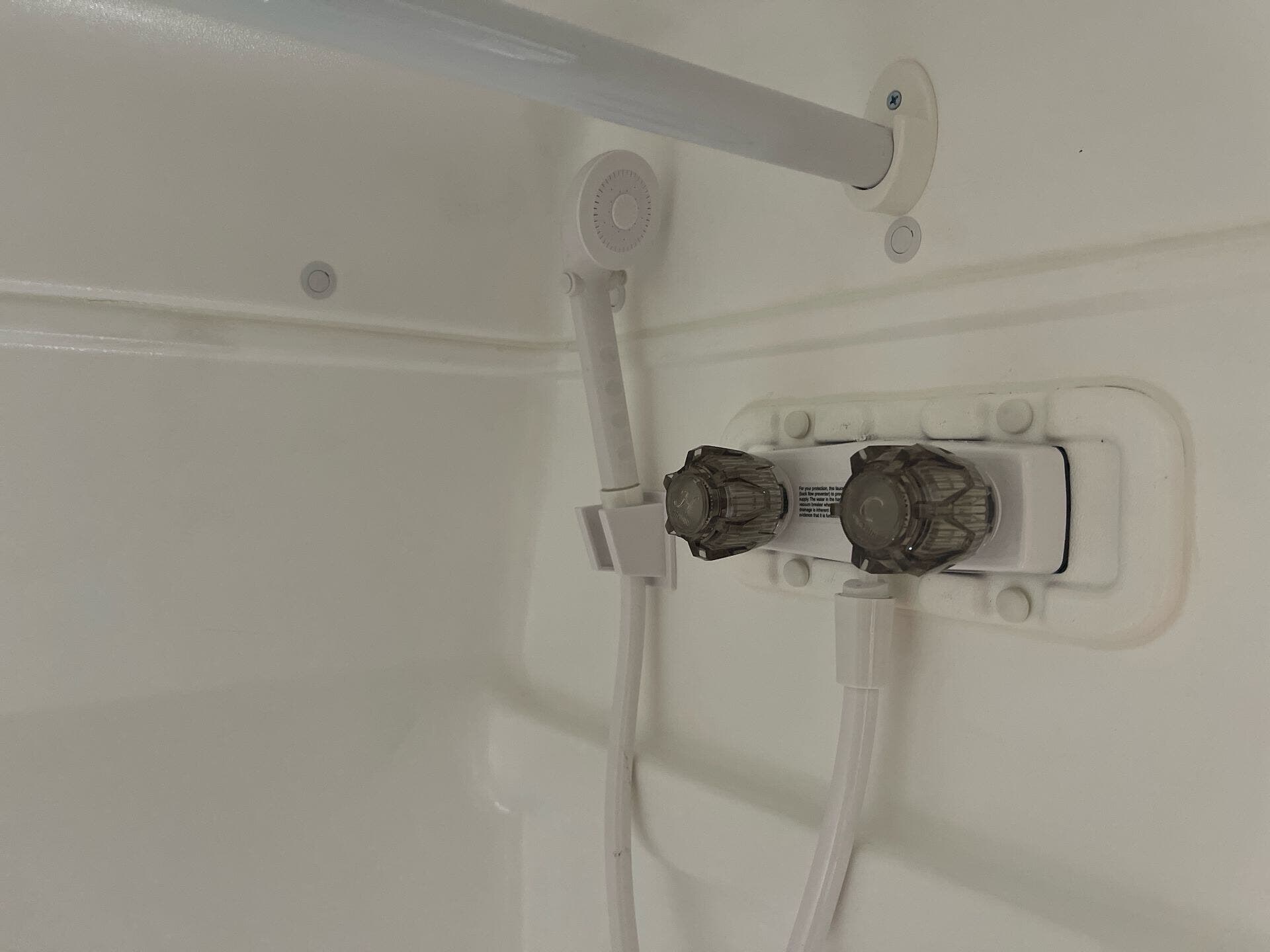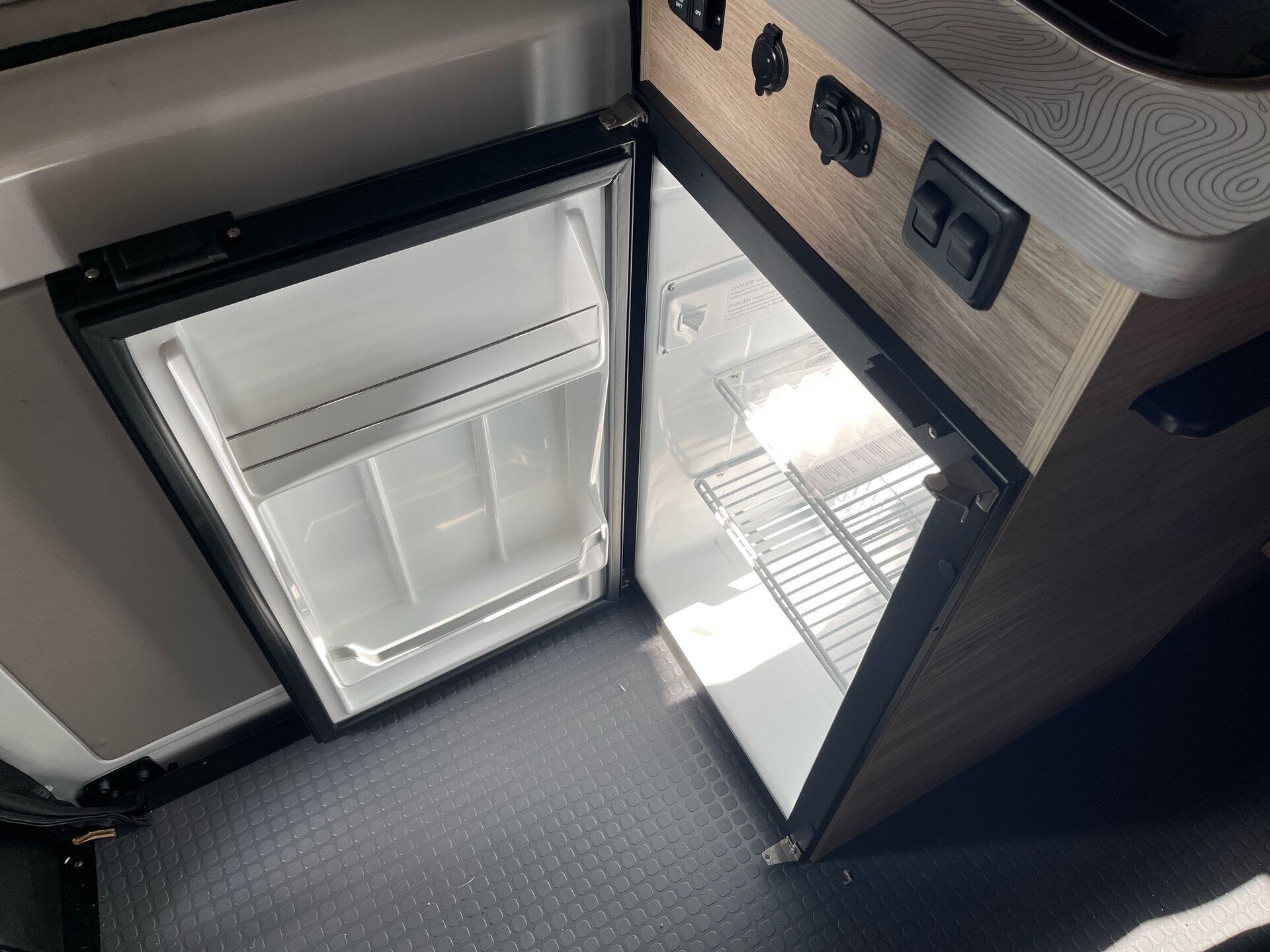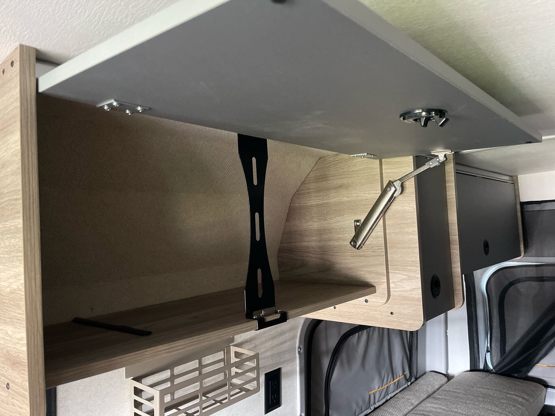 Roomy inside, the 59P sleeps four: a rear Murphy+ bed that folds into a lounge and a pop-top loft above for kids or guests. The wet bath incorporates a flexible showerhead and cassette toilet. The central galley features a two-burner stove, 3-cuft compressor fridge/freezer, stainless sink, and pull-out countertop extension.