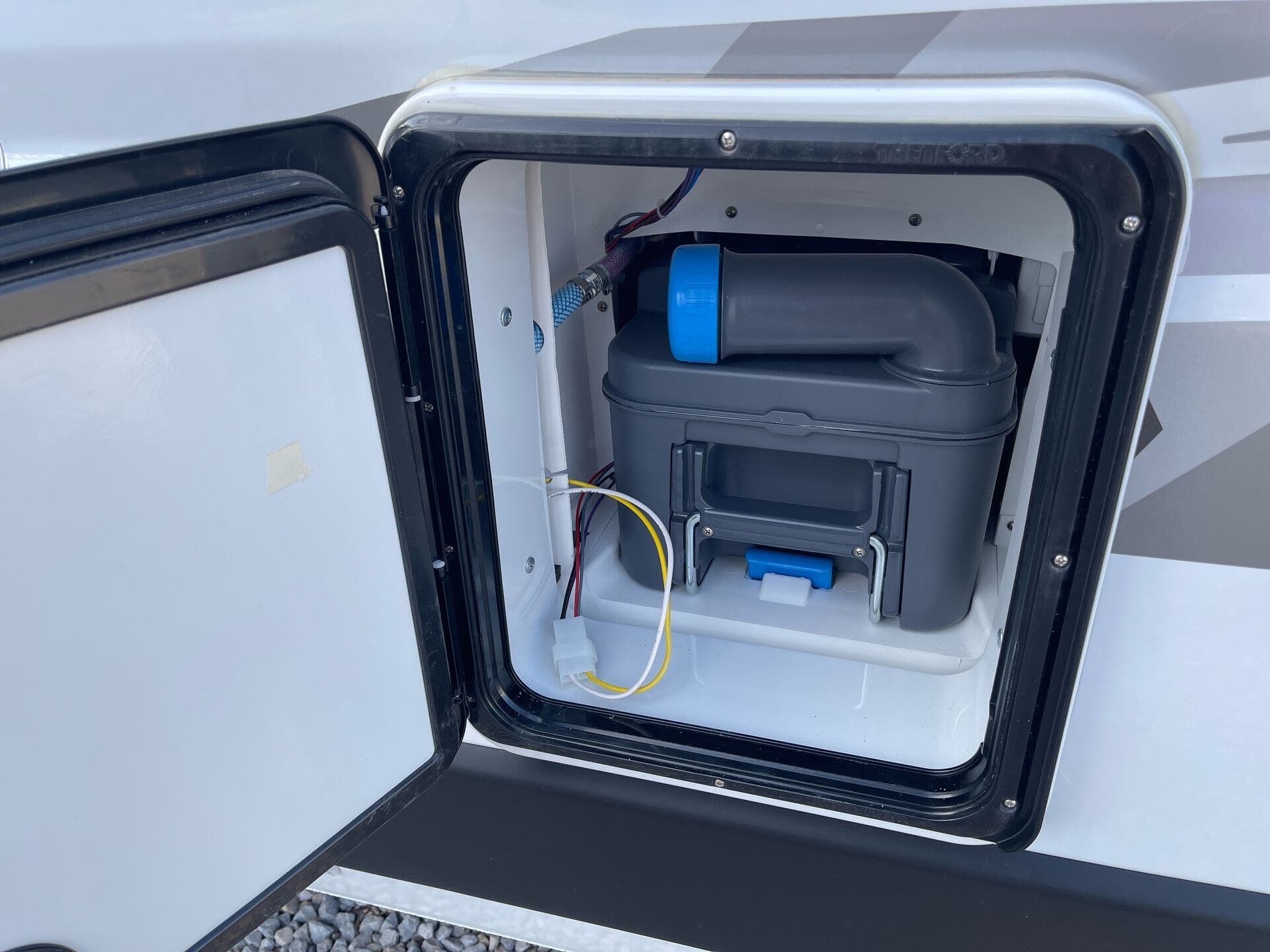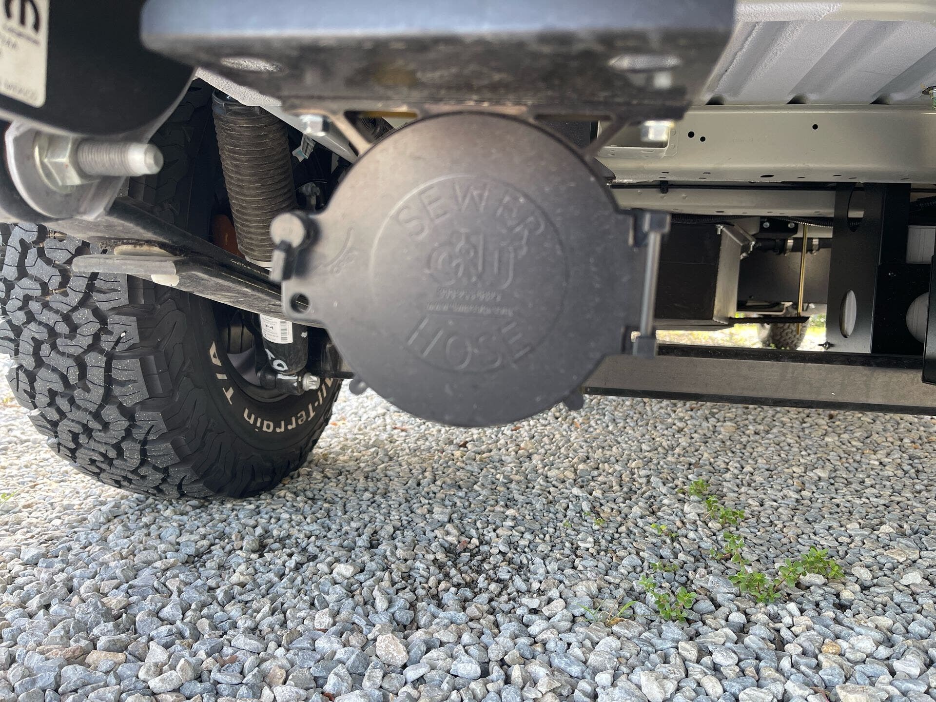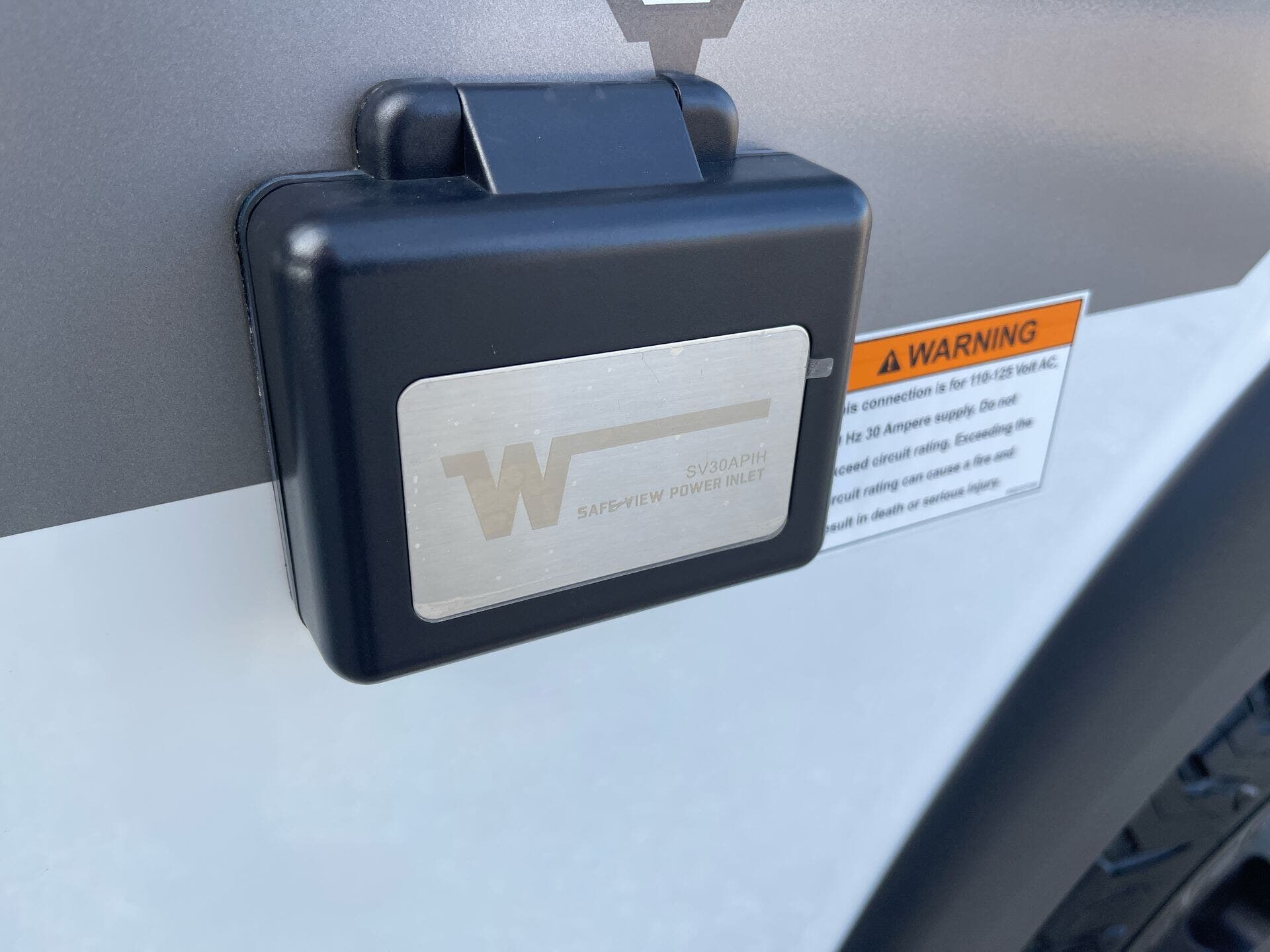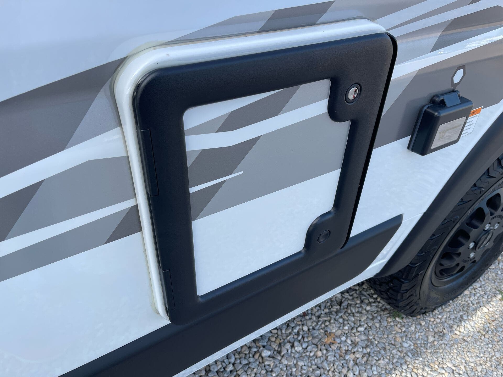 Designed for off-grid adventure, it includes heavy-duty vinyl flooring, tinted windows, below-floor storage, L-track gear tie-downs (on 59PX), and a smart water system with on-demand pump, exterior wash port, and Eco-Hot water heater. Power is supported by dual AGM batteries, 30-amp hookup, and 220W flexible solar panels paired with a power converter/charger.