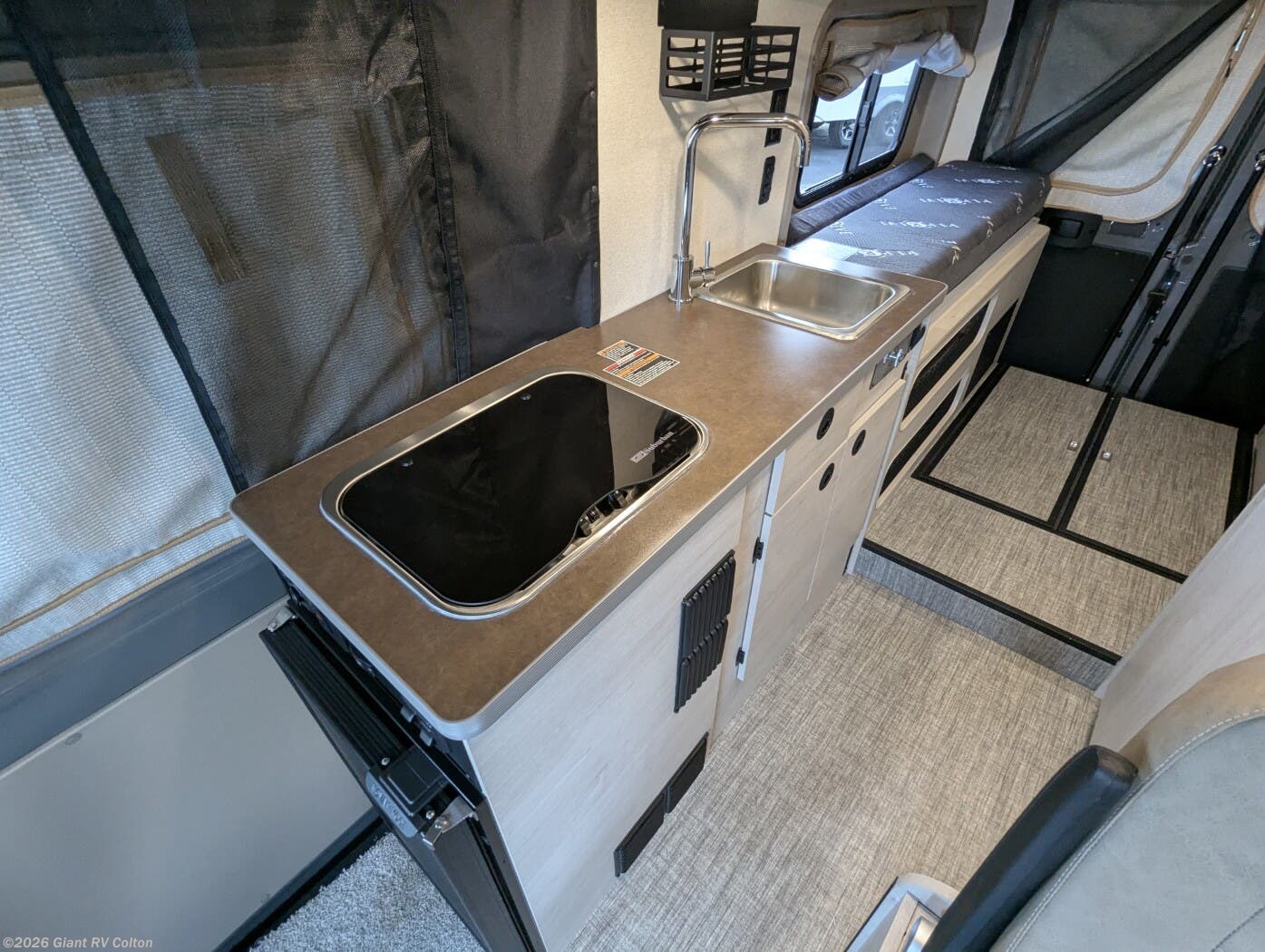 - Complete Galley & Dining Space including a sink with cover, two-burner cooktop, 110 V refrigerator/freezer, microwave, and ample food/storage space — perfect for meal prep on the road or campsite dinners.