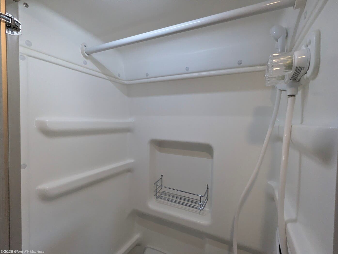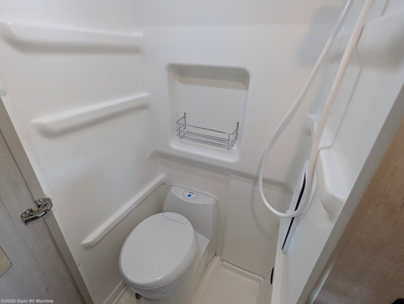 - Dedicated Wet Bath & Comfort Features with a cassette toilet, shower, skylight, and vanity storage, complemented by LED lighting, USB/110 V outlets, privacy shades, and optional lithium power/solar for off-grid capability.
