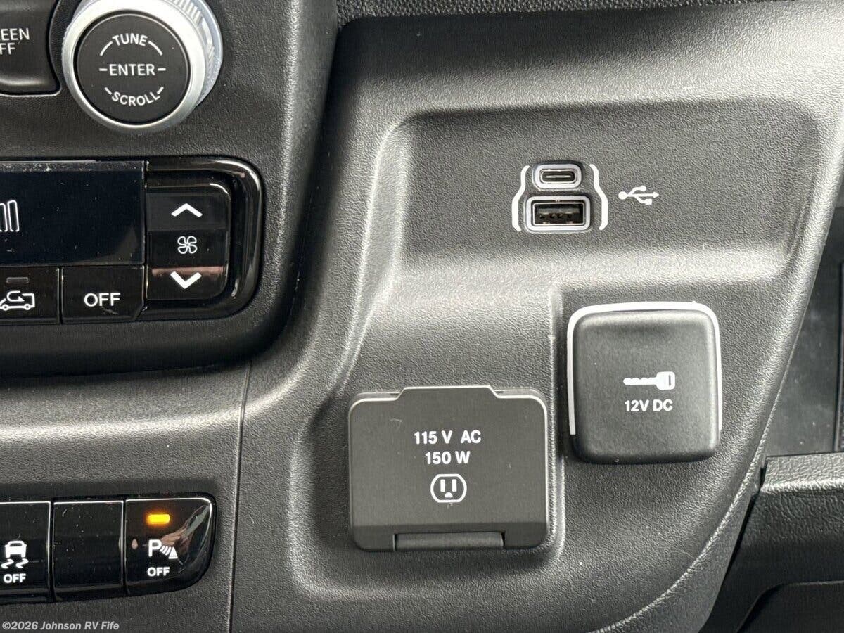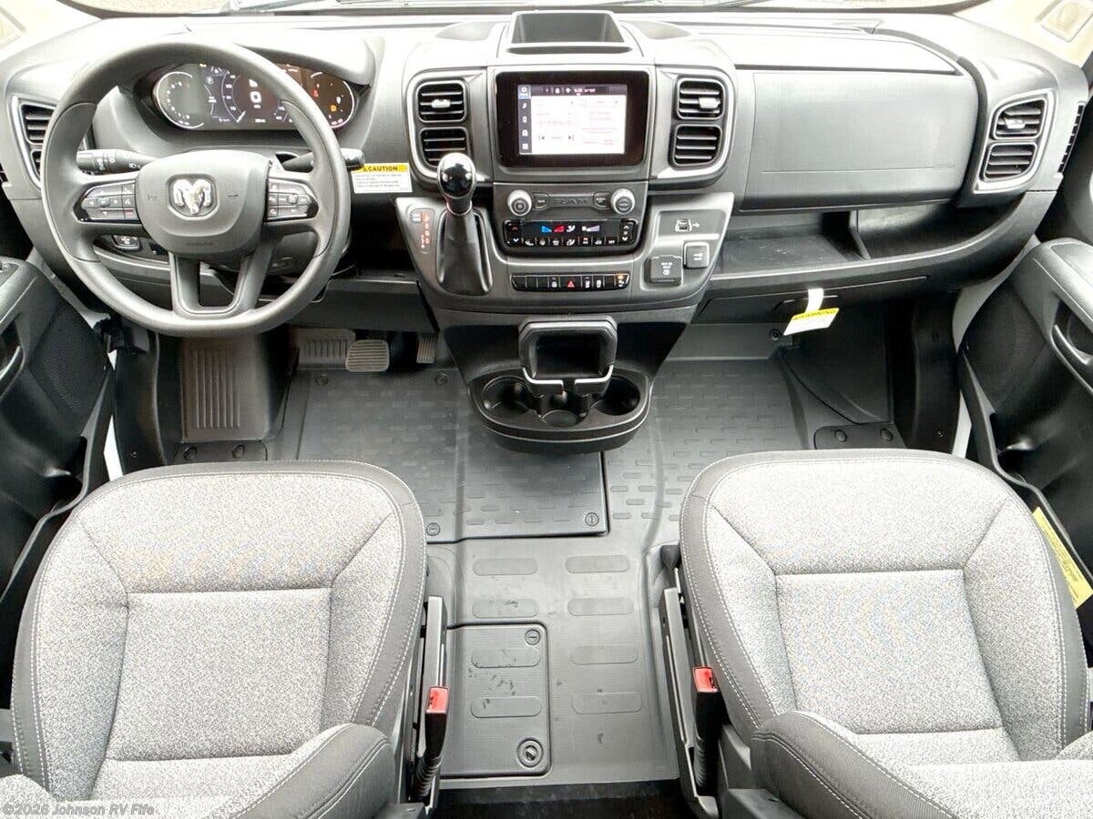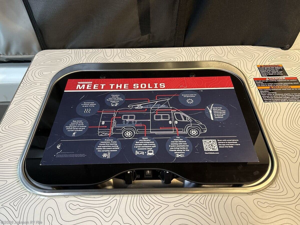The 2026 Winnebago Solis NPF is a versatile and modern Class B recreational vehicle designed for adventure seekers and comfort lovers alike. Built on the reliable Ram ProMaster chassis, this RV combines robust performance with a host of features to ensure a smooth and enjoyable journey. Under the hood, the Solis NPF is powered by a 3.6L V6 gas engine, delivering 280 horsepower through a 9-speed automatic transmission. This setup is complemented by a 180-amp alternator and all-terrain tires, making it well-suited for various driving conditions. The vehicle also includes a 3500-pound hitch with a harness connector, enhancing its towing capabilities. Safety is a priority in the Solis NPF, featuring: - Crosswind Assist - Full-Speed Forward Collision Warning - Pedestrian Automatic Emergency Braking - Post Collision Braking The cab is designed for convenience and comfort, offering: - Power door locks with remote - Power windows - Front and side window privacy panels - Slide swivel recline adjustable cab seats - Driver and passenger airbags - 12v power points - Touchscreen radio with rearview monitor - Navigation and USB ports - Push button start - Electric power steering - Steering wheel controls - Power defrost side-mirrors - Cruise control Inside, the living space is thoughtfully designed to maximize comfort and functionality. Features include: - Aluminum running board pet loop - Porch light and driver side service light - Side and rear screen doors - Rod and privacy screen - Entry assist bar - Heavy-duty vinyl flooring with a removable padded floor mat - Tinted coach windows with zipped coverings - LED ceiling lights and reading lights - Removable pedestal table - Below floor storage and MOLLE panel, galley storage pack The dining area is equipped with: - Dinette seating with seatbelts and a child seat tether anchor - Laminate topographical countertop with a pull-out counter extension - Stainless steel sink and spice rack - 12v 3cf refrigerator freezer - 2-burner cooktop with glass cover - SmartSpace overland drawer For electronics, the Solis NPF includes: - Systems monitor panel - LP CO and smoke detectors - 110v, 12v, and USB charging ports Sleeping arrangements are comfortable and flexible, featuring: - Pop-top sleep system with a sleeping ladder - Murphy+ bed with storage access - Slat bed system - Deluxe power vent fan The bathroom is compact yet functional, offering: - Wet bath (31x24 inches) - Bathroom mirror - Shower surround with curtain - Flexible shower head - Removable clothes rod - Swiveling cassette toilet Mechanically, the Solis NPF is equipped with: - Two Group 31 AGM deep cycle batteries - Battery disconnect switch - Solar panel with controller and 220w flexible surface solar panel - 30-amp service cord and 55-amp converter charger - Ground fault interrupter - LP tank with gauge - 13.5k AC directional ducts - Truma Combi Eco heating system - Eco-hot water system - Water center control panel - Heated drainage system - 10-foot sewer hose - Outside wash station The 2026 Winnebago Solis NPF is a well-rounded RV that combines performance, safety, and comfort, making it an ideal choice for those looking to explore the open road with all the amenities of home. ??