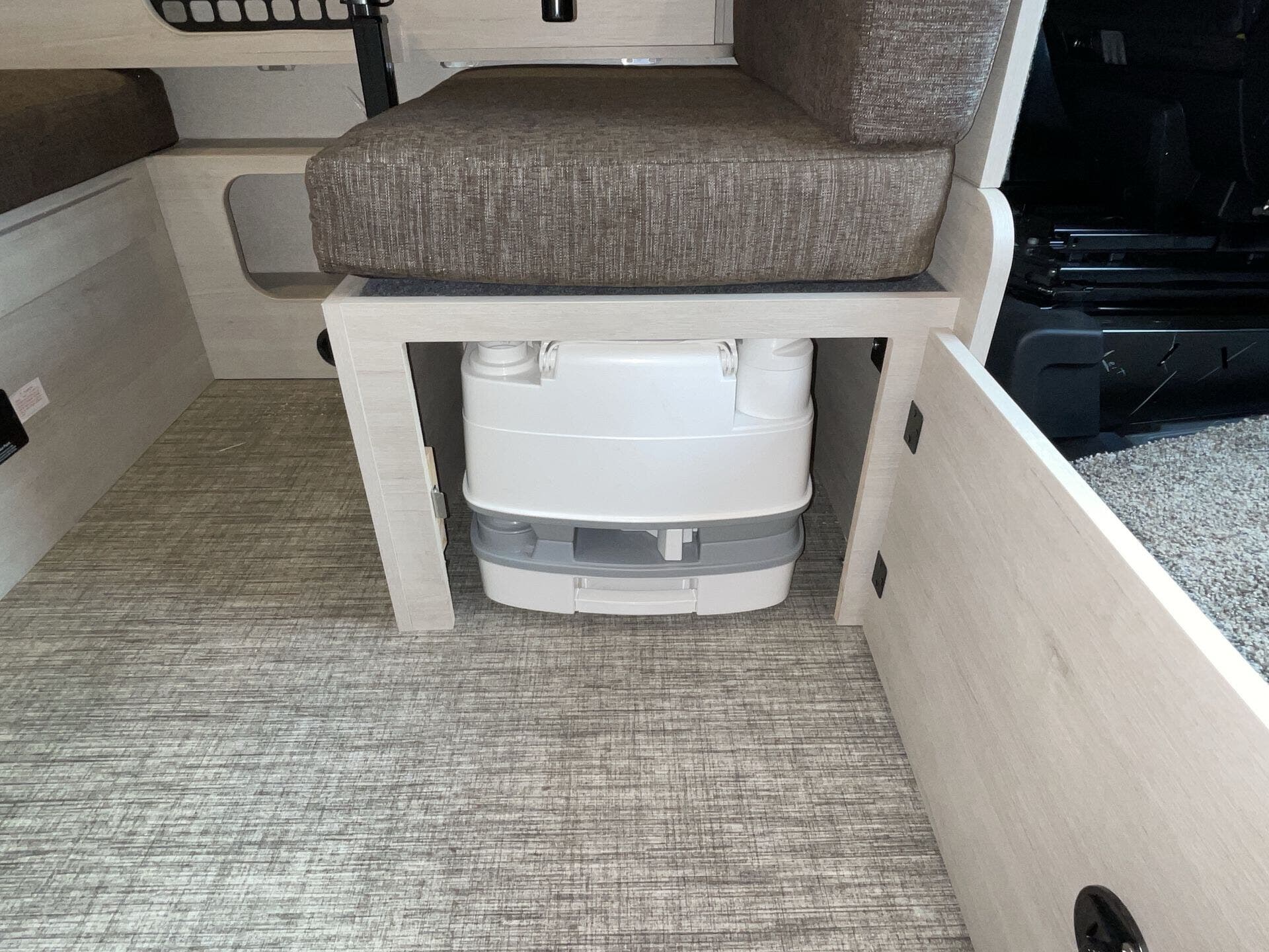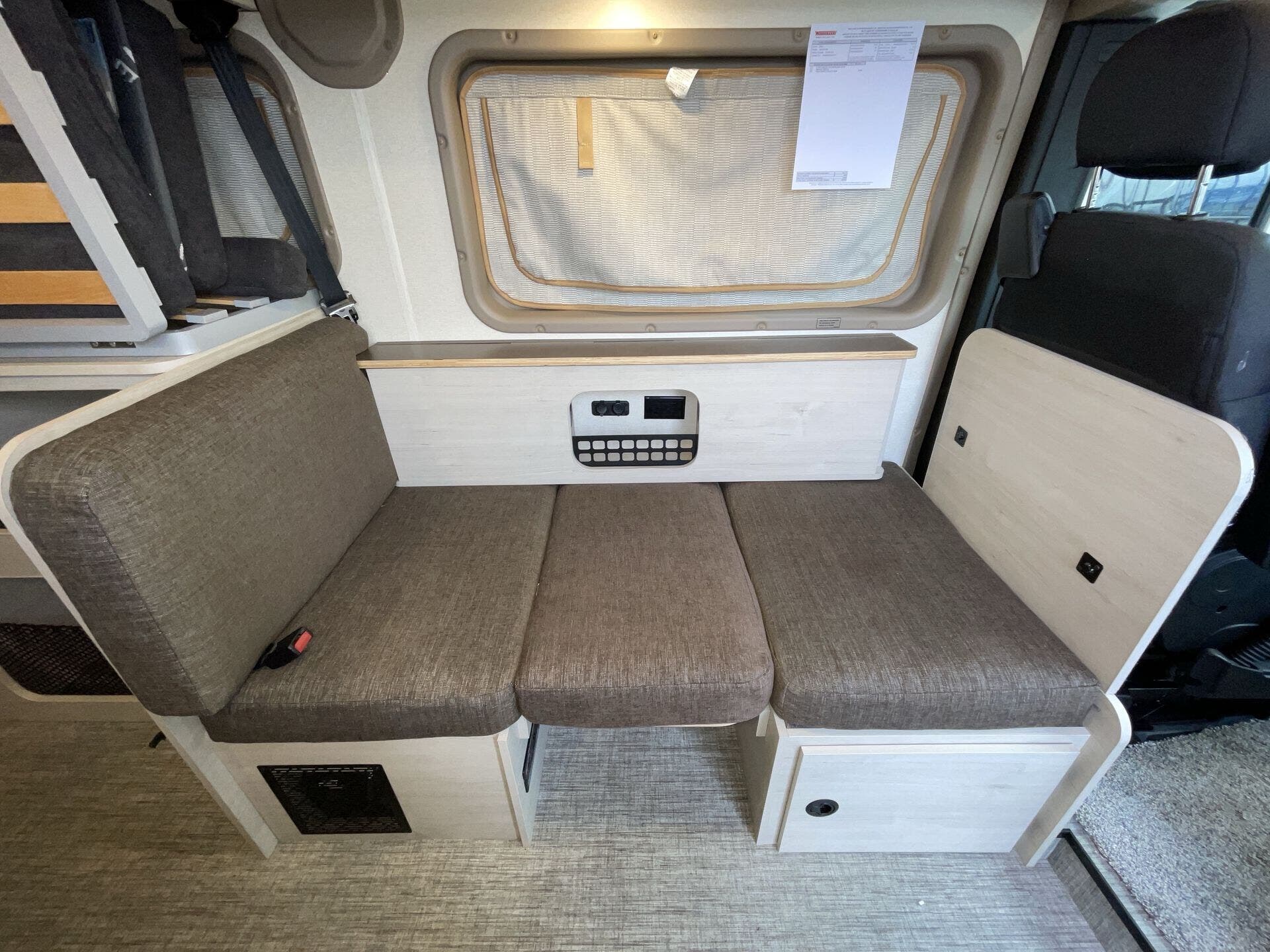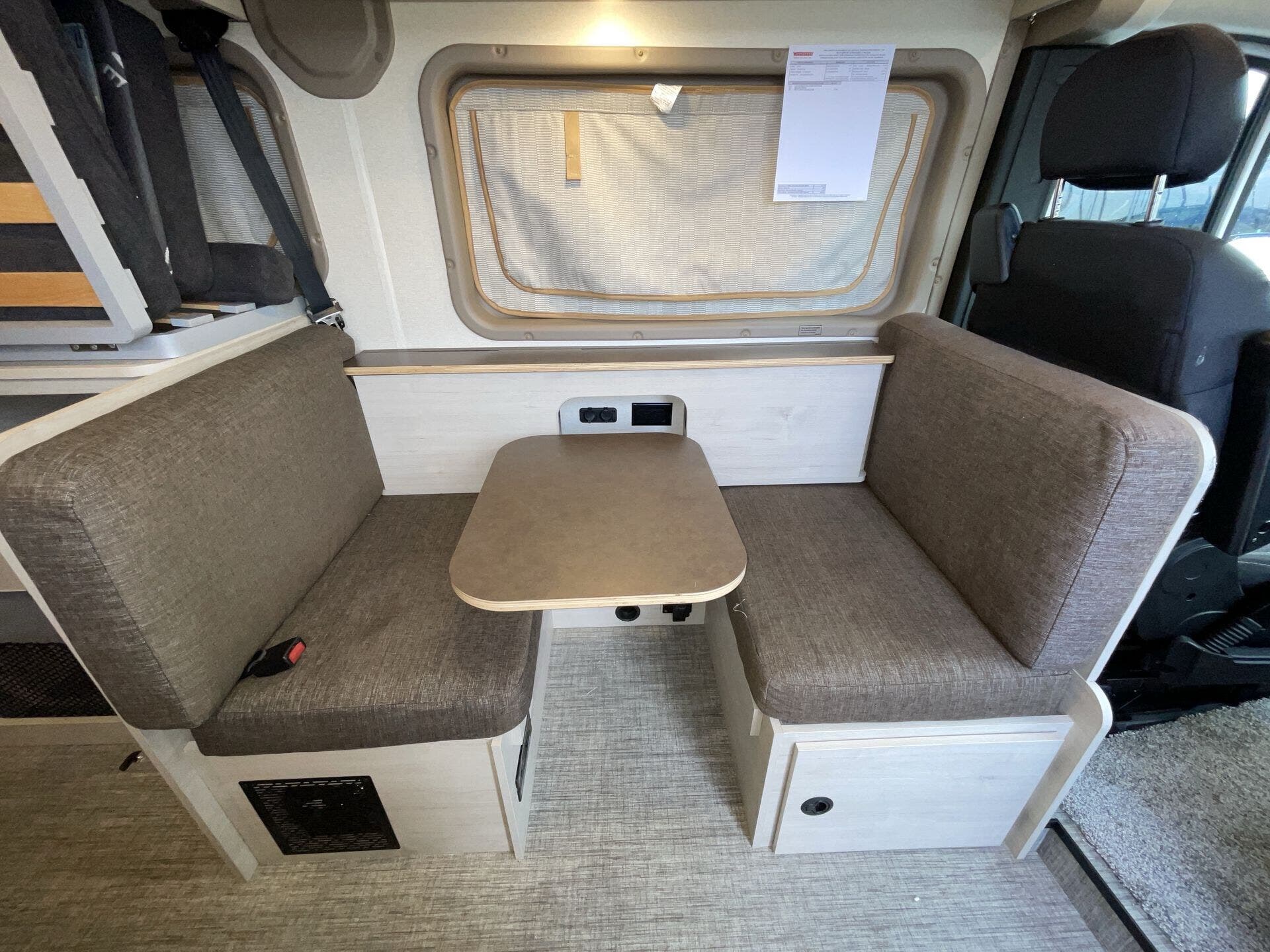 Inside, the dinette area converts into different setups depending on how you want to use it: hangout space, eating area, or a sleeping surface if you need it.