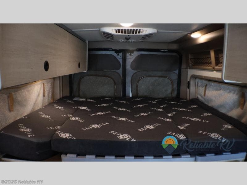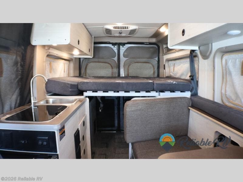 Enjoy versatile living in this motorhome! As you enter the rear double doors, you will notice the 52" x 75" Murphy+ bed with a mattress cover that can be brought down for a good night's rest. You can prepare delicious home cooked meals while out on the road with the two burner range with glass cover, the stainless steel sink, and the single door compressor-driven 3.0 cu. ft. refrigerator/freezer, and enjoy them at the dinette. This dinette offers many different variations like a sleeping mode, a sofa mode with a table, a daybed mode with a table, and a settee loveseat mode. Plus, underneath the dinette is a storage area for the portable toilet. A rigid MOLLE panel cargo gate and L-track cargo tie-downs ensure your cargo will stay in place as you travel!