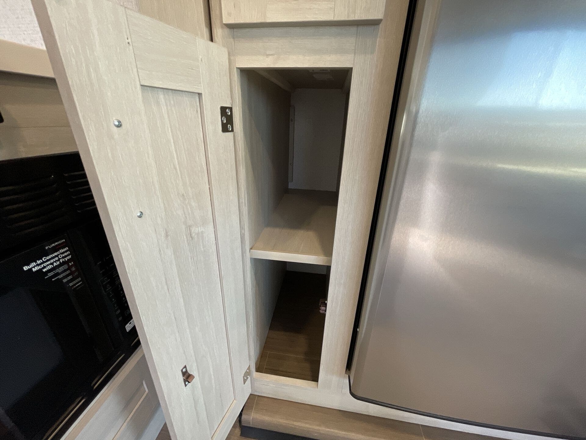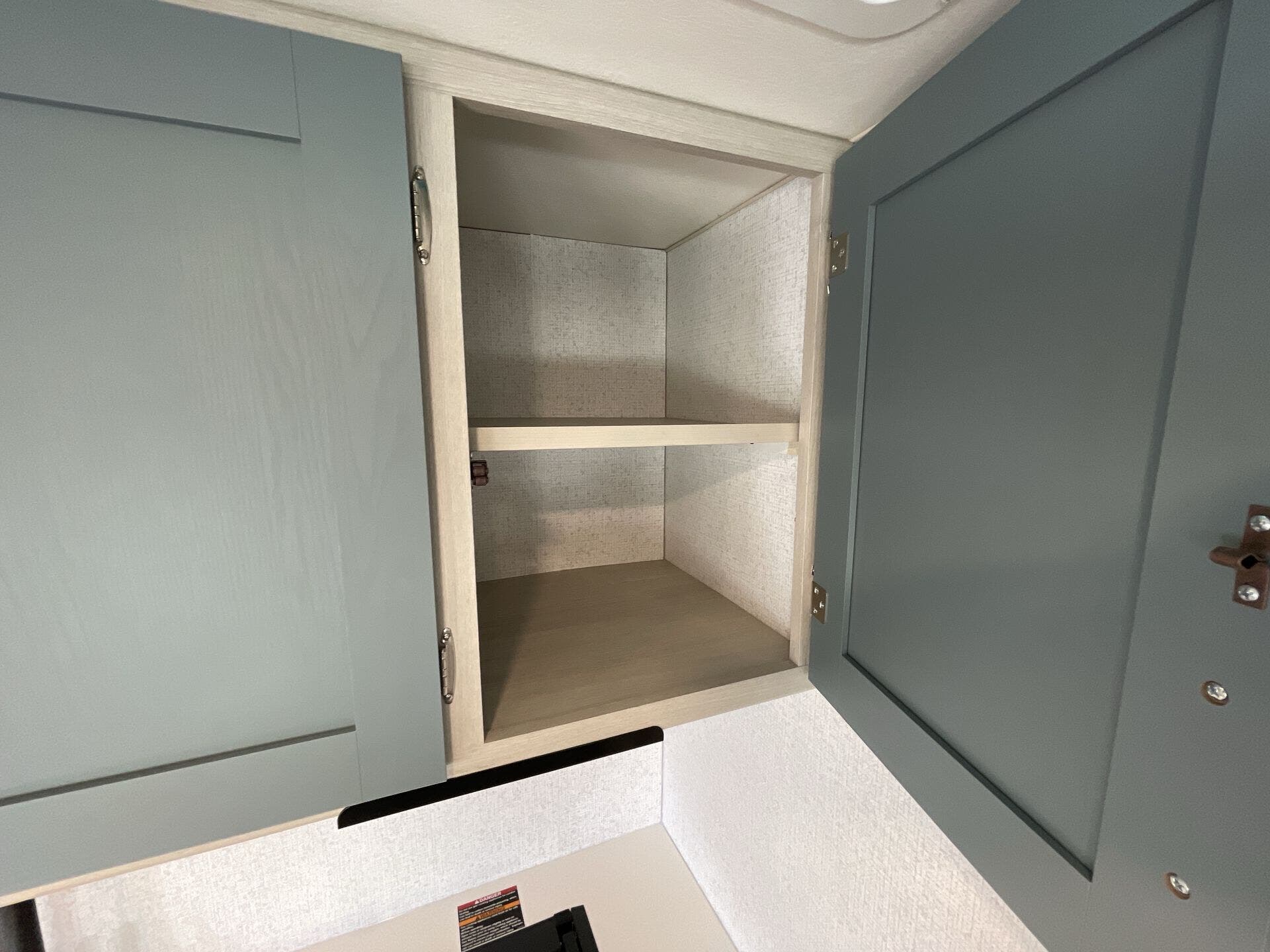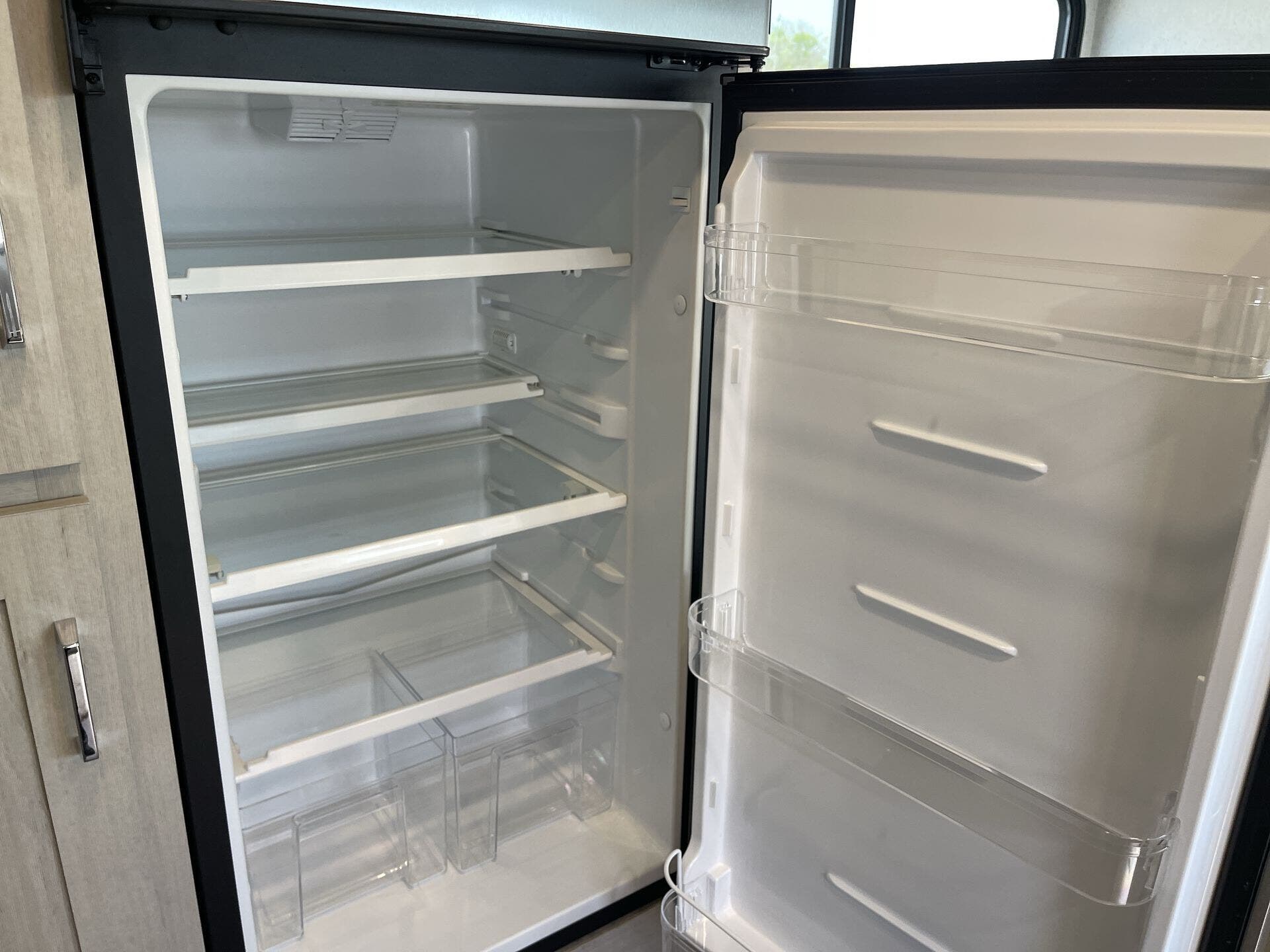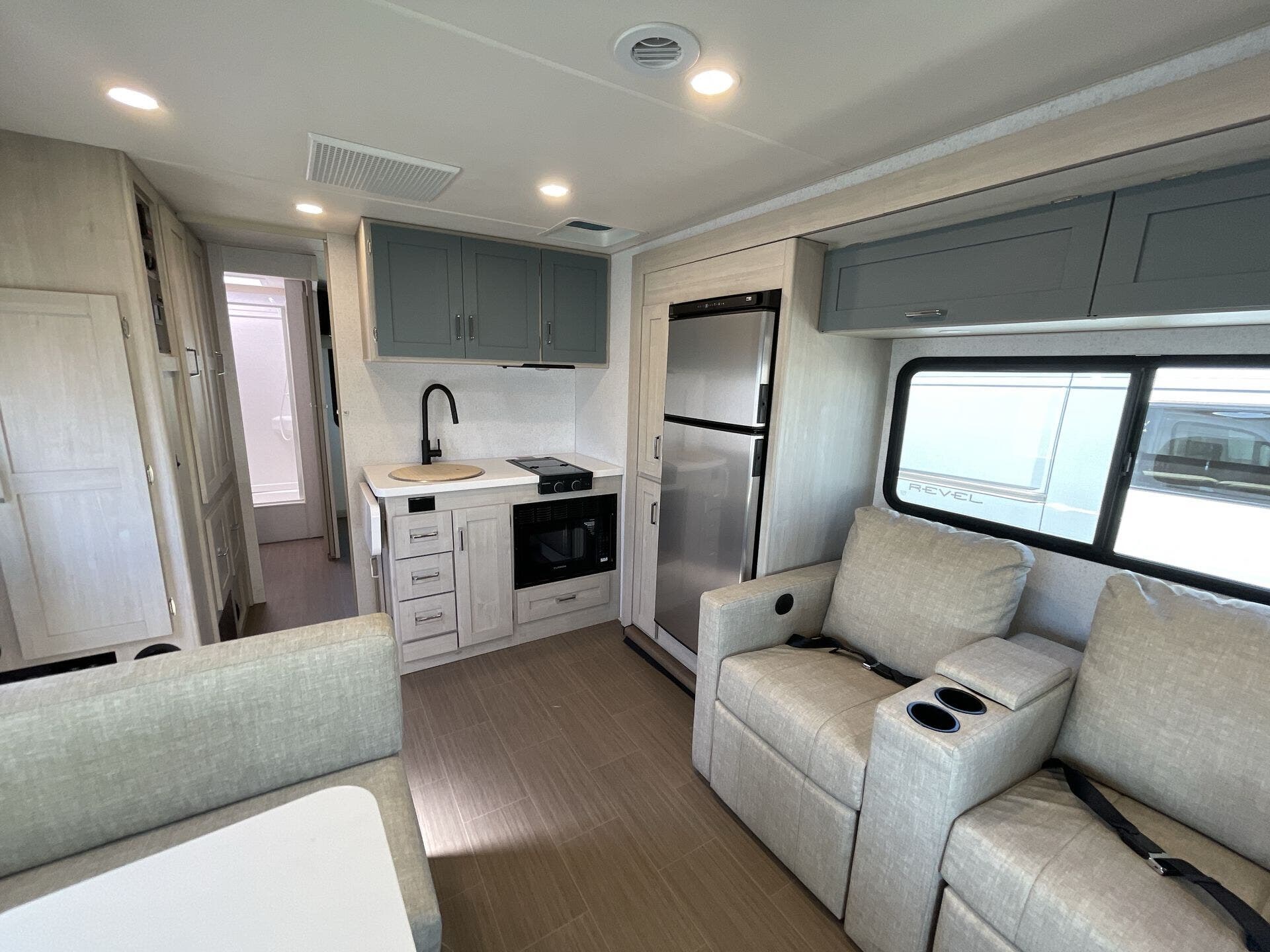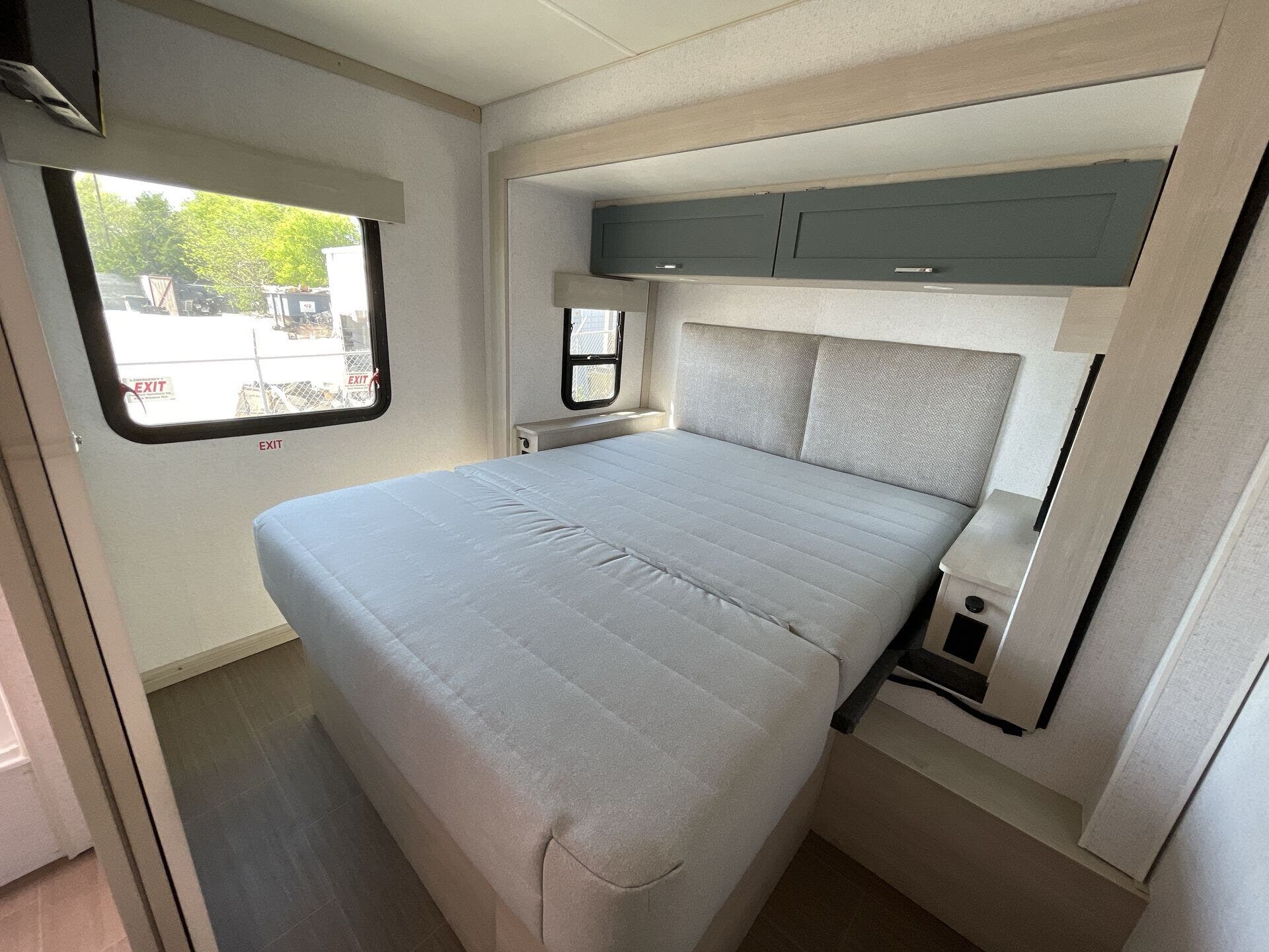 Inside, the 26FE features a spacious and intelligently designed floorplan that maximizes comfort and usability. The rear bedroom provides a private retreat with a comfortable bed and ample storage, while the main living area includes a convertible dinette, sofa, and an entertainment center for relaxing evenings. The fully equipped kitchen comes with solid-surface countertops, a three-burner cooktop, refrigerator, microwave, and plenty of cabinetry, making it easy to prepare meals and enjoy home-style living wherever your journey takes you.