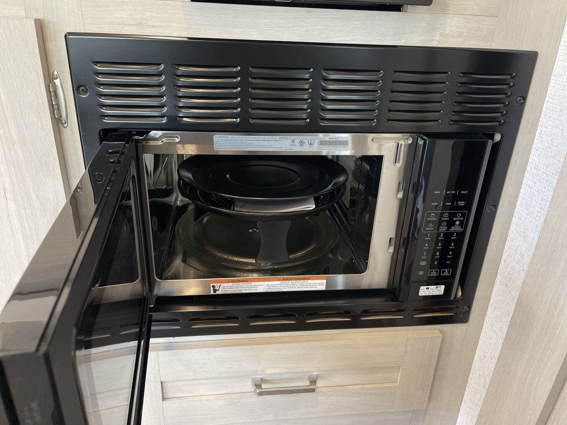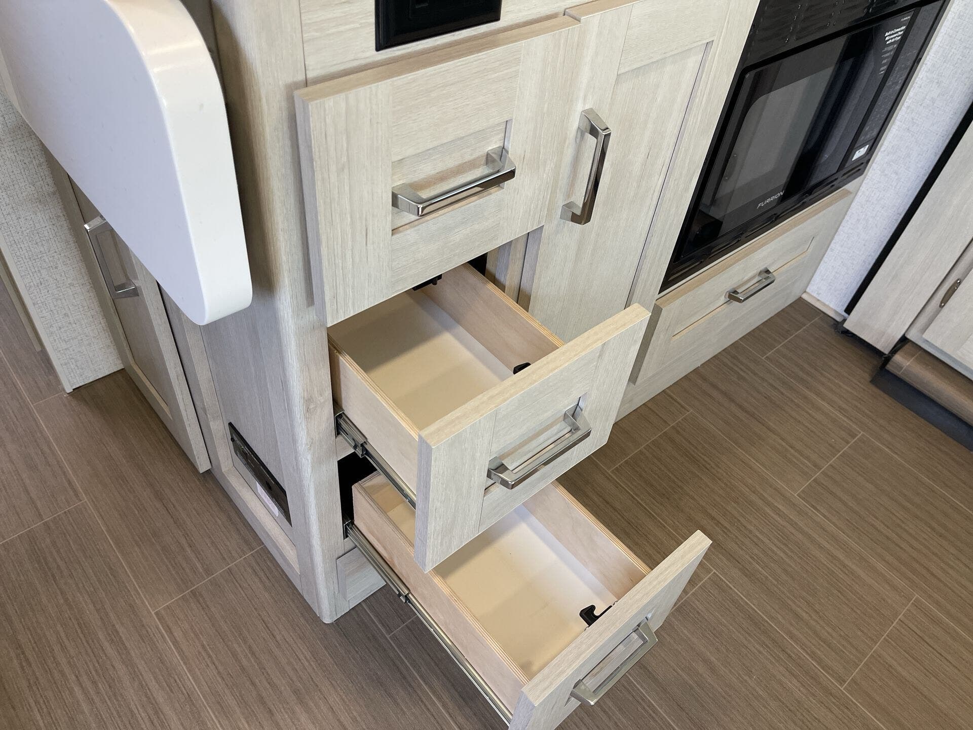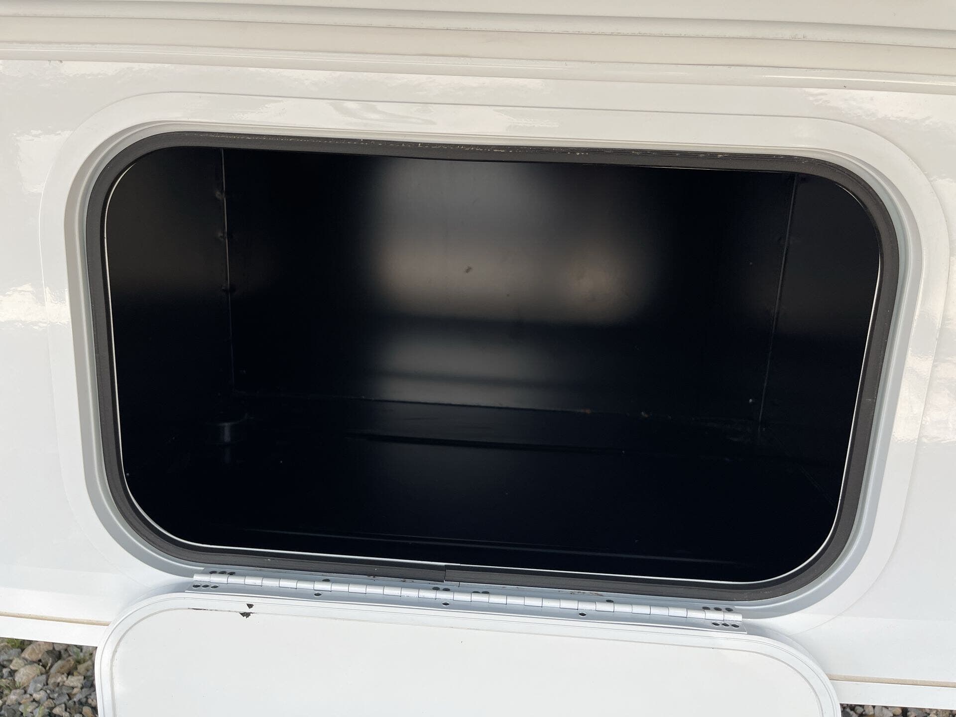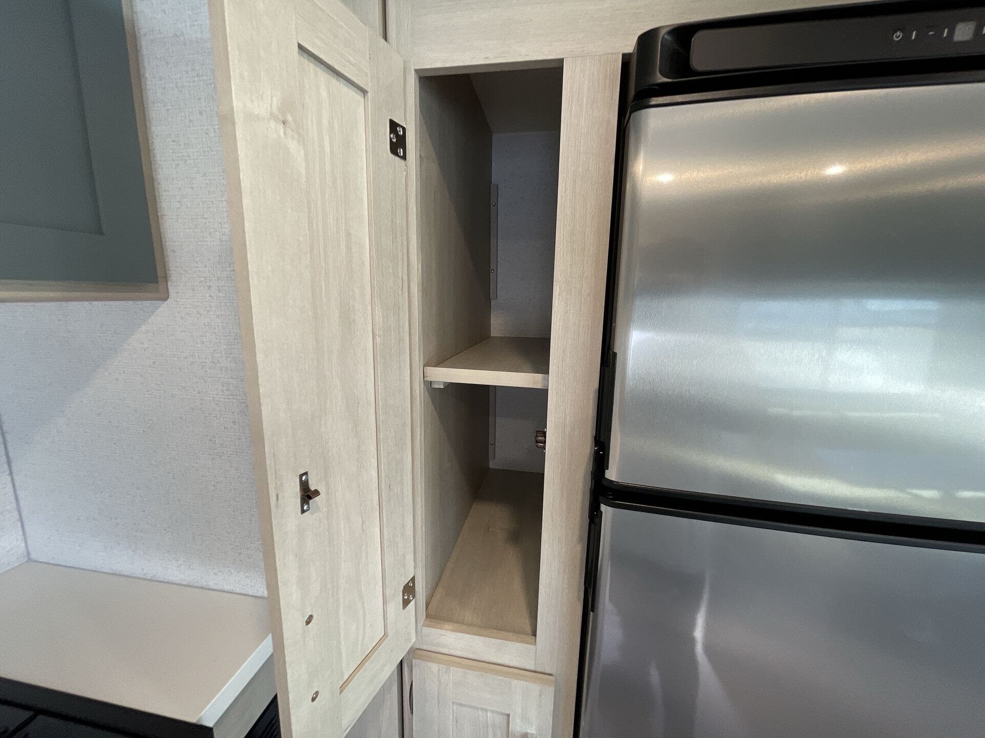 Inside, the 26FE features a spacious and intelligently designed floorplan that maximizes comfort and usability. The rear bedroom provides a private retreat with a comfortable bed and ample storage, while the main living area includes a convertible dinette, sofa, and an entertainment center for relaxing evenings. The fully equipped kitchen comes with solid-surface countertops, a three-burner cooktop, refrigerator, microwave, and plenty of cabinetry, making it easy to prepare meals and enjoy home-style living wherever your journey takes you.