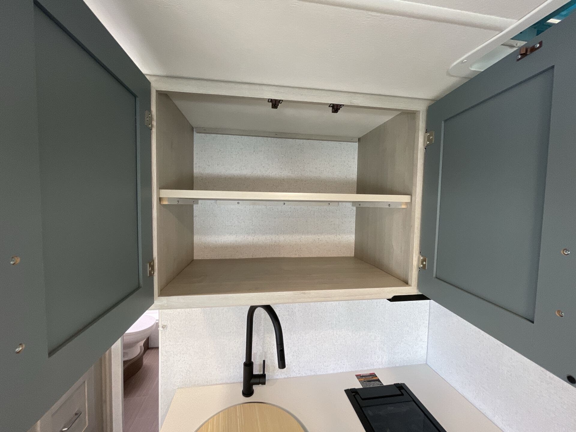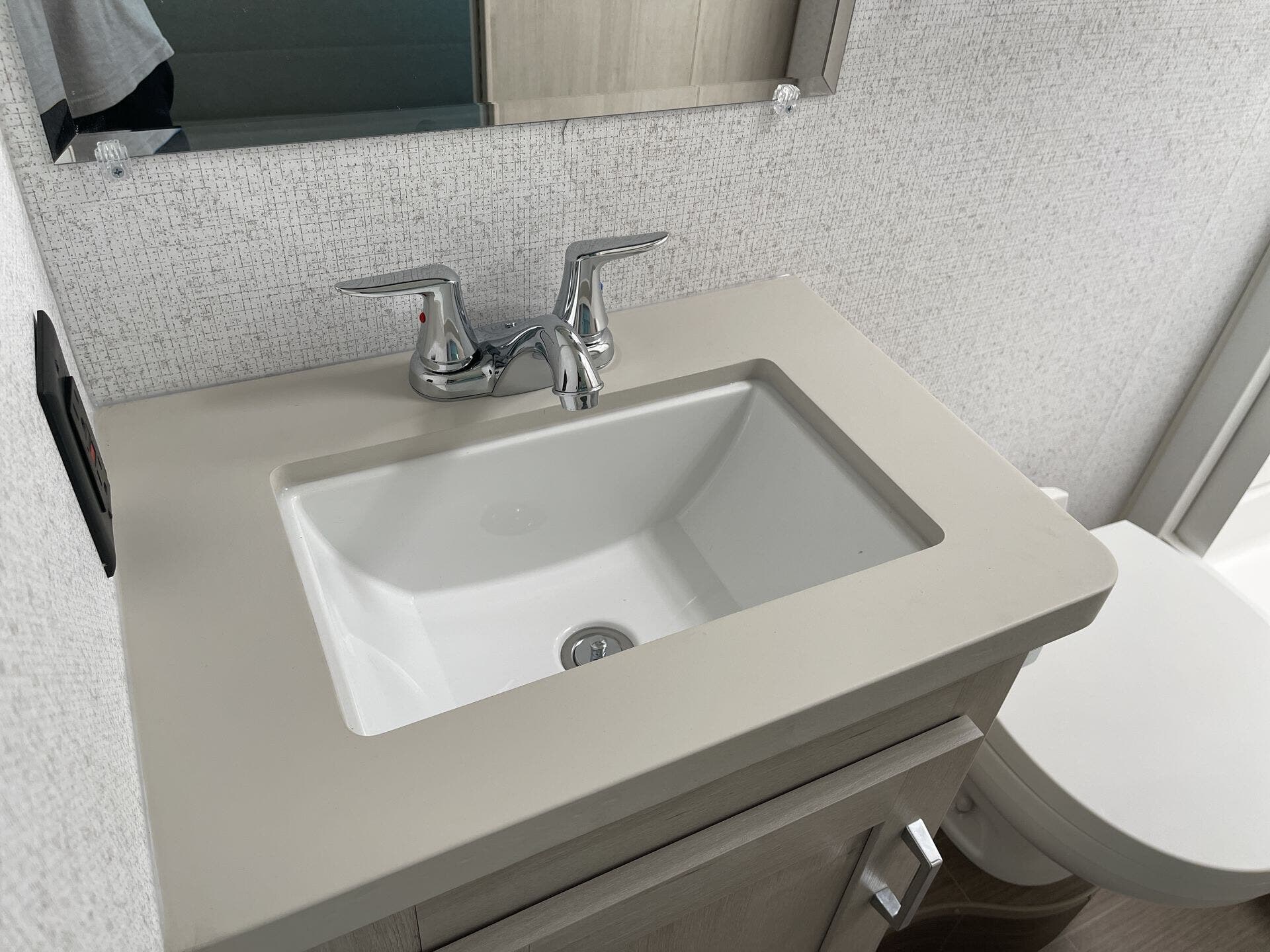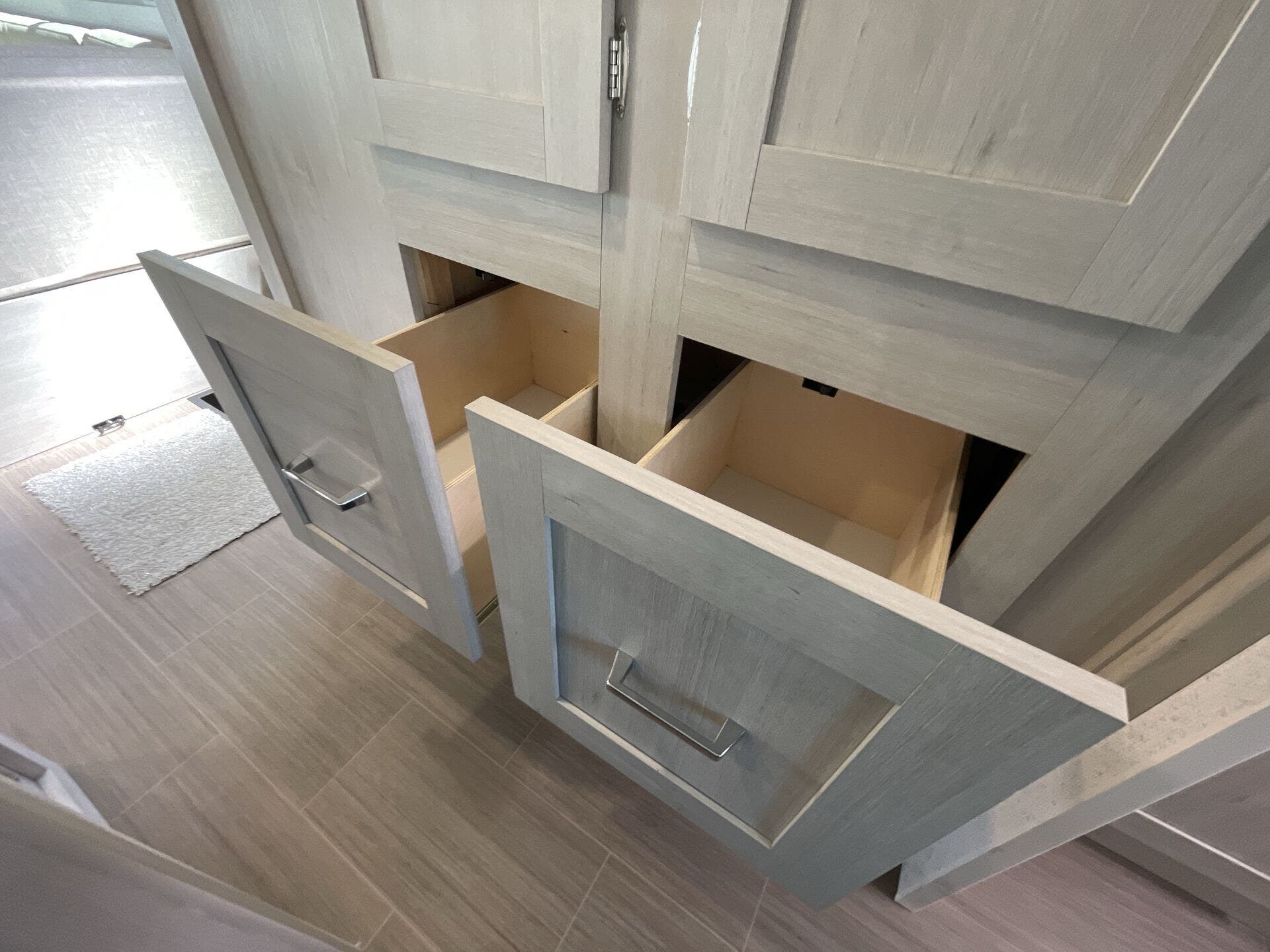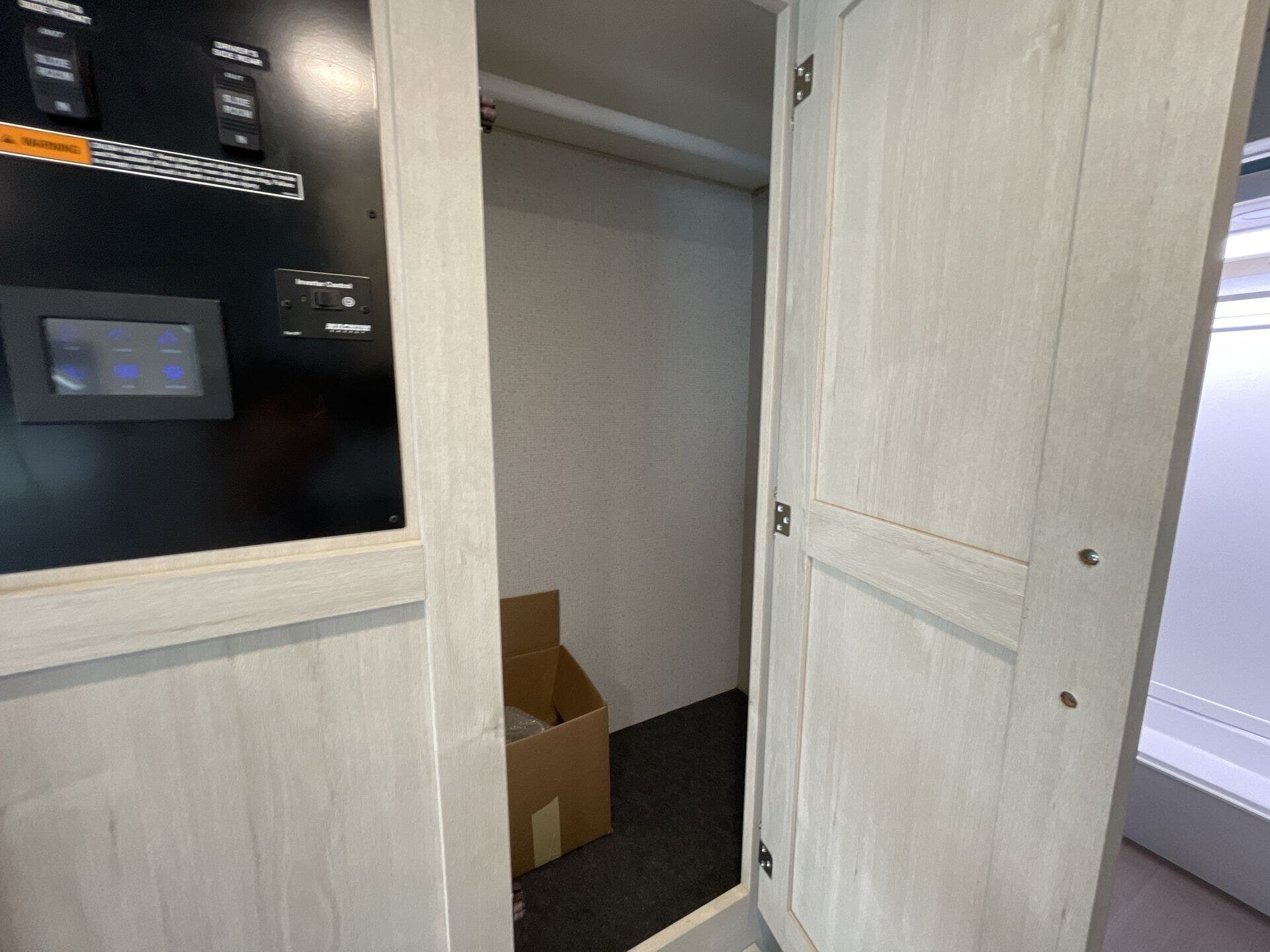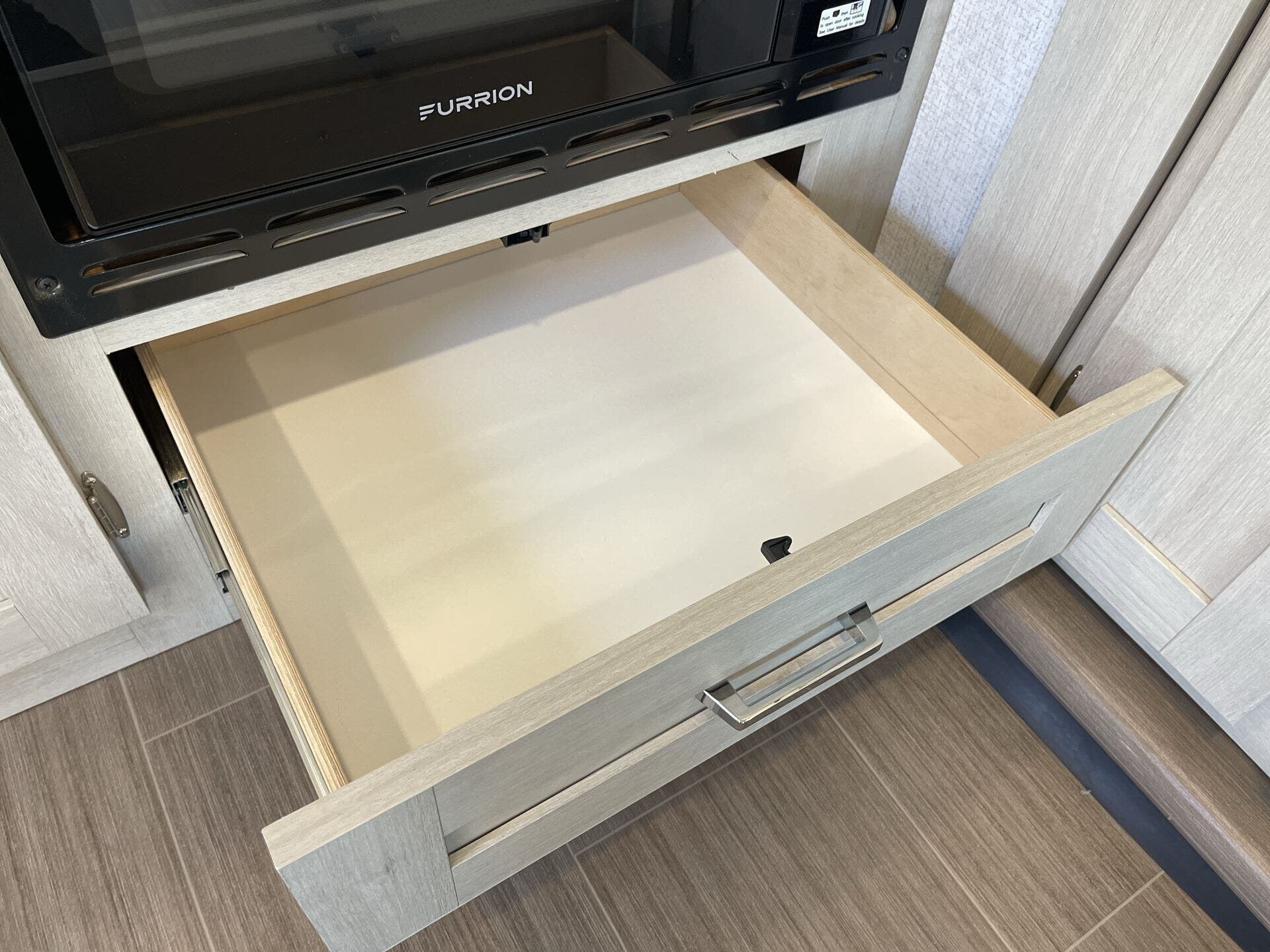Inside, the 26FE features a spacious and intelligently designed floorplan that maximizes comfort and usability. The rear bedroom provides a private retreat with a comfortable bed and ample storage, while the main living area includes a convertible dinette, sofa, and an entertainment center for relaxing evenings. The fully equipped kitchen comes with solid-surface countertops, a three-burner cooktop, refrigerator, microwave, and plenty of cabinetry, making it easy to prepare meals and enjoy home-style living wherever your journey takes you.