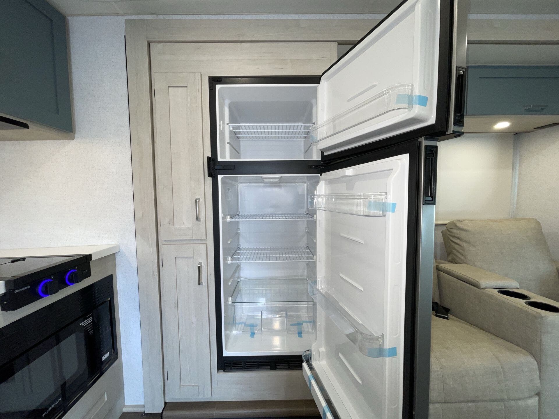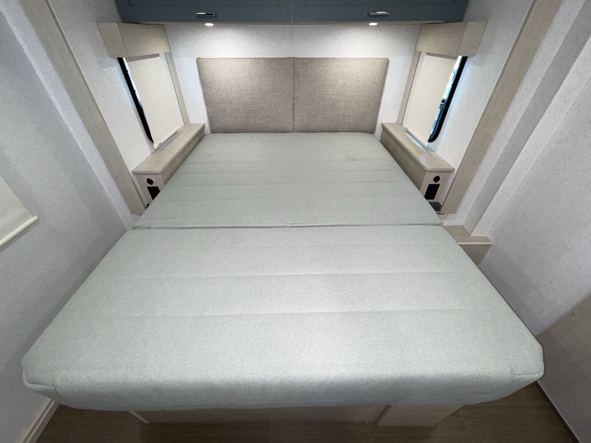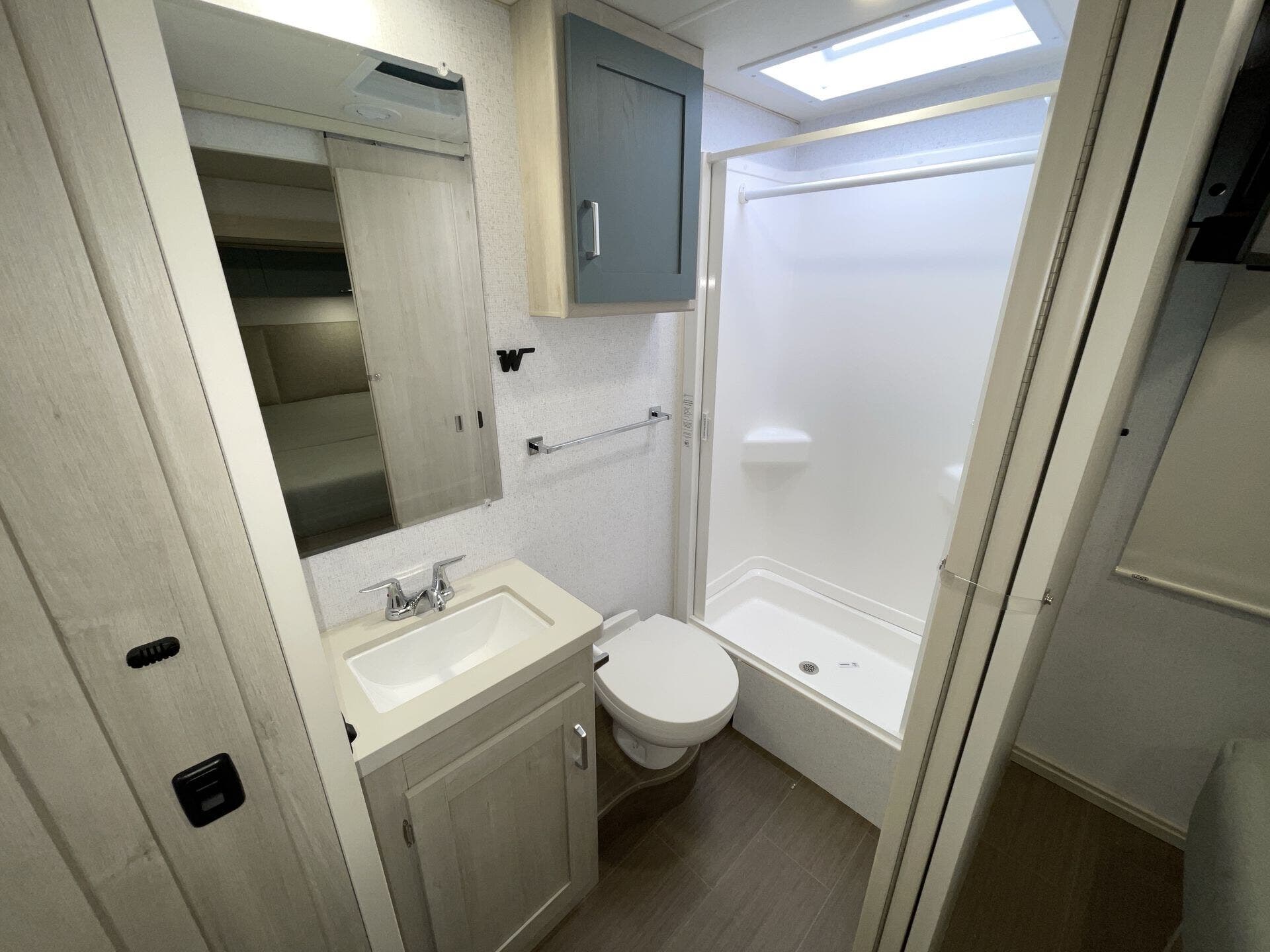 The mid-coach kitchen provides generous counter space and storage, making meal prep easy whether you’re on a quick trip or staying out longer. In the back, the private bedroom features a walk-around queen bed and a spacious bathroom, creating a comfortable place to unwind after a day on the road. With sleeping space for up to six and a length of about 28 feet, the Sunflyer 26FE offers a great balance of drivability, space, and everyday convenience for road trips or extended adventures.