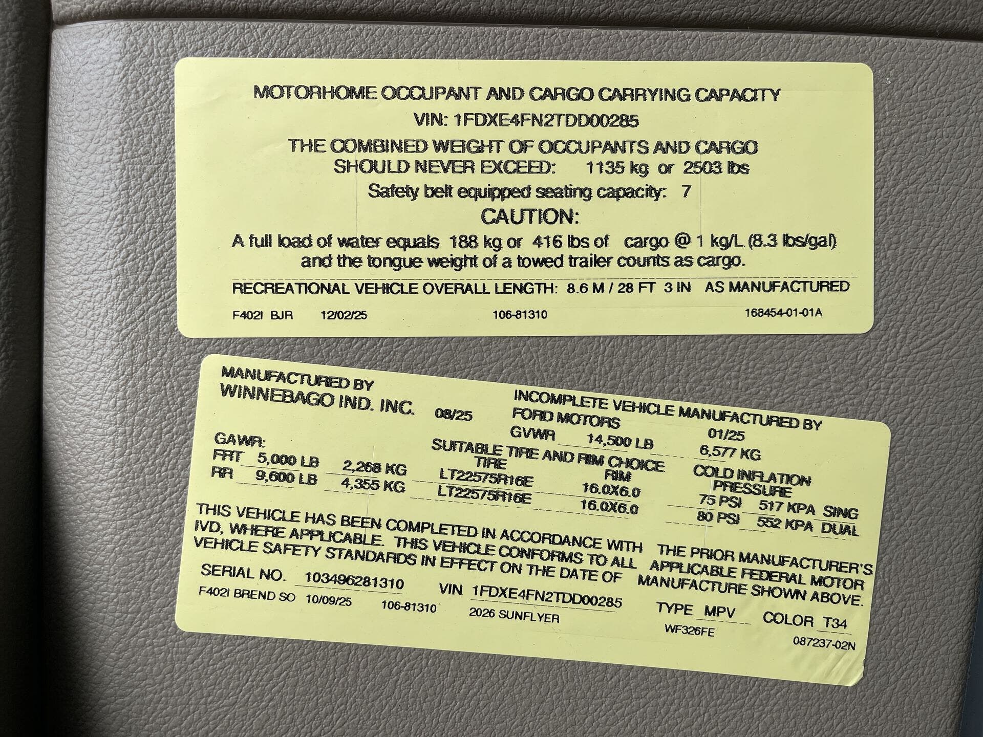 2026 Winnebago Sunflyer 26FE Specifications