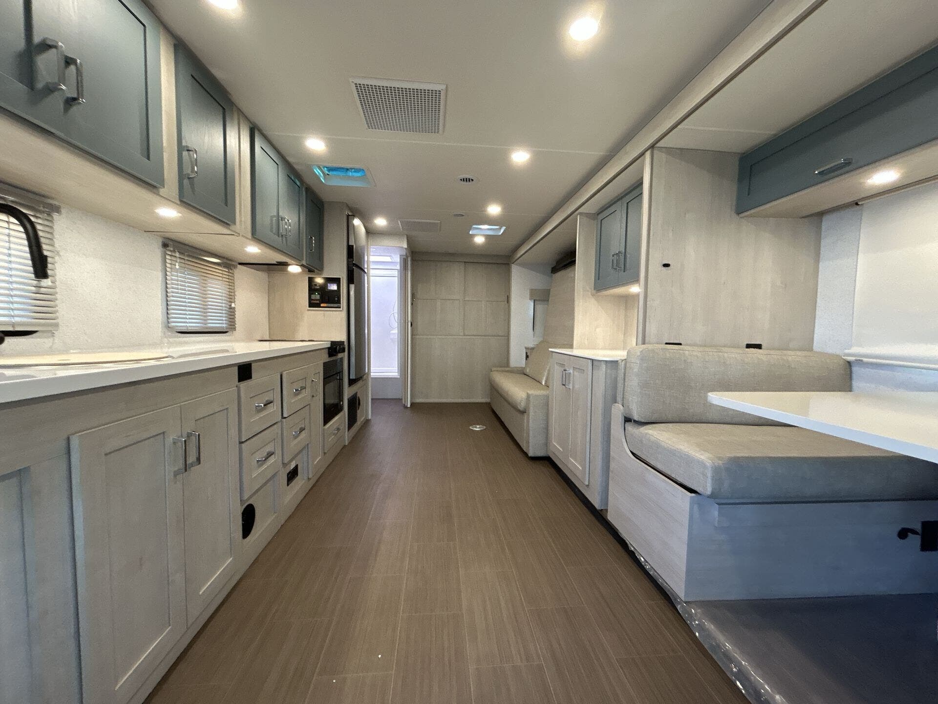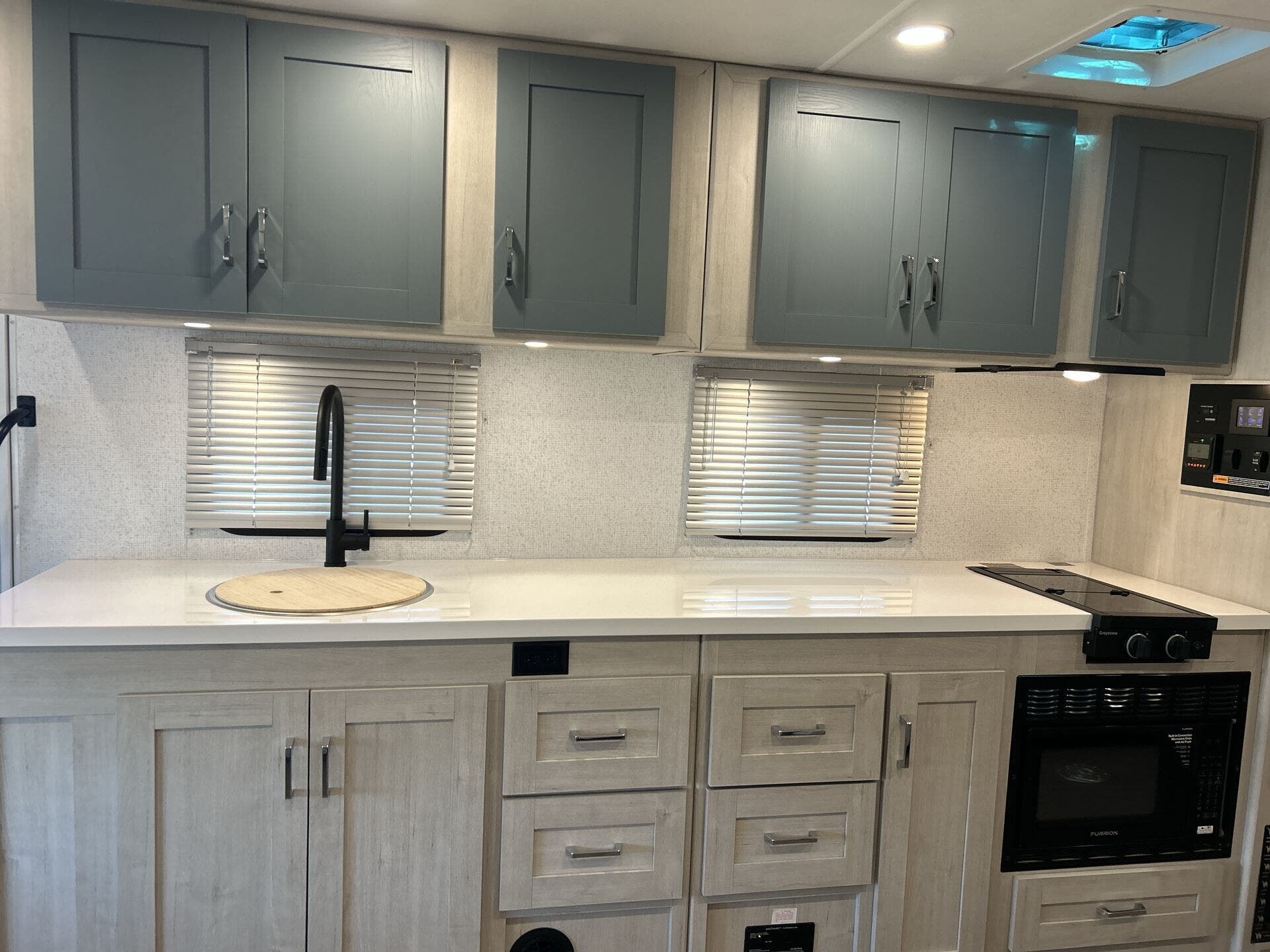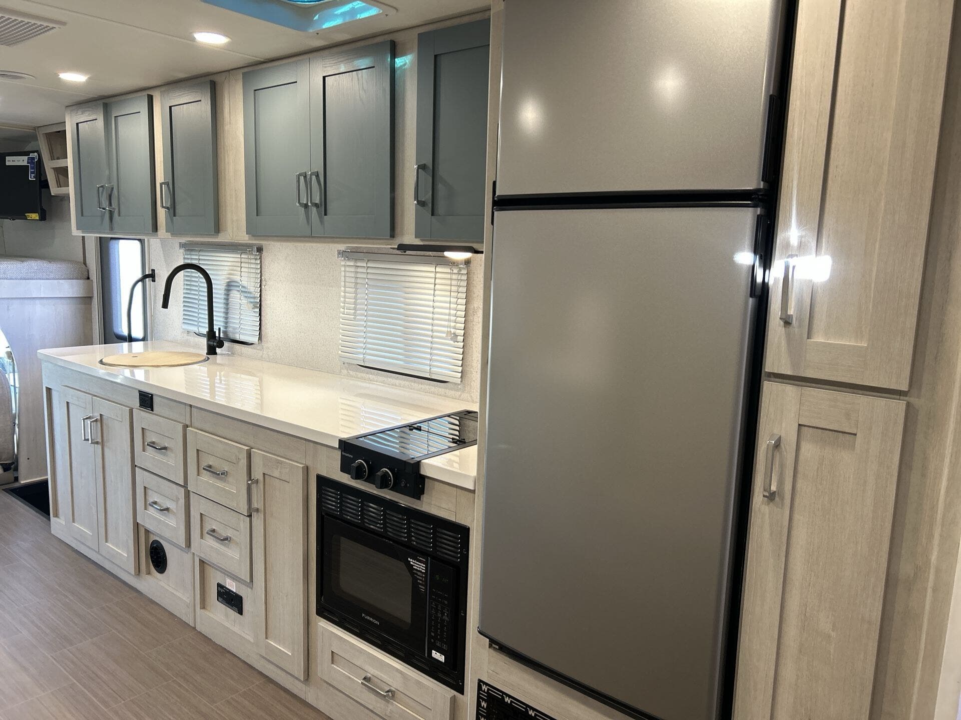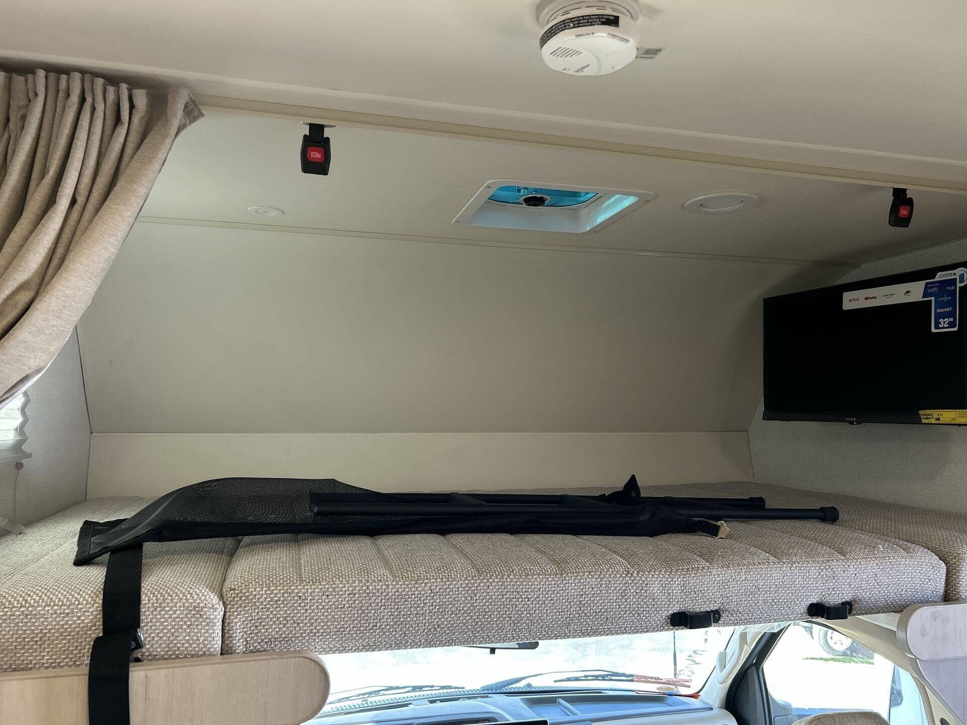 The Sunflyer’s thoughtful layout features a front living area that transitions smoothly into a functional mid kitchen, then flows to a private rear bedroom and bath. The 28MB floorplan includes one slideout to enlarge the living area, enhancing lounge space, dining options, and movement throughout the cab and rear sections. Bunk beds provide flexible sleeping arrangements for kids or additional guests, while a medicine cabinet and roof vents add practicality and comfort to everyday use. A TV and an exterior awning further elevate the home-on-the-road experience for entertaining and outdoor enjoyment.
