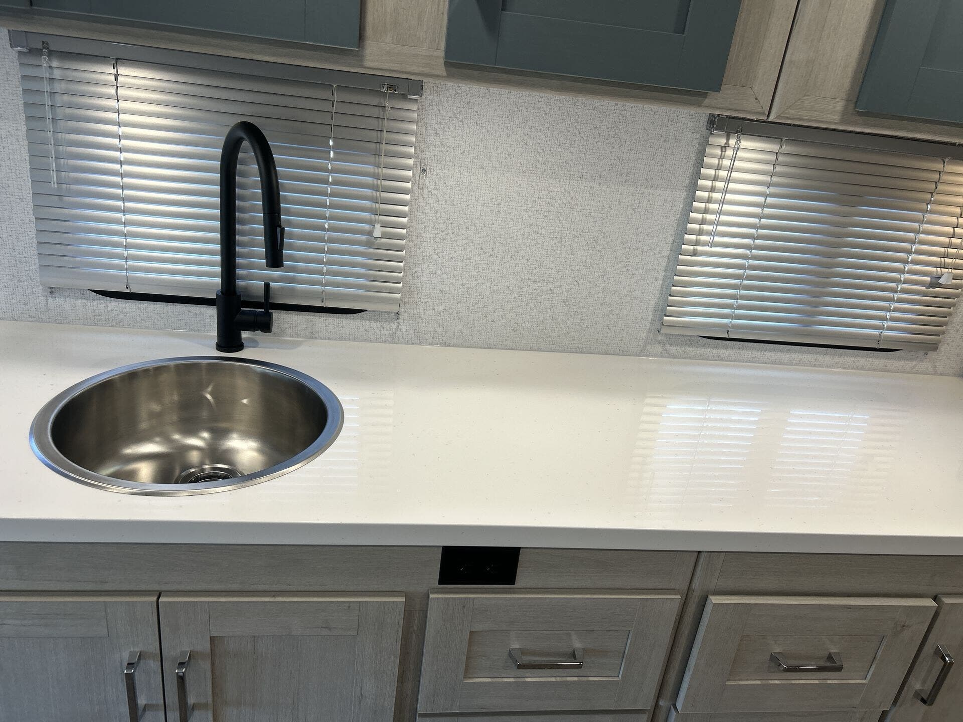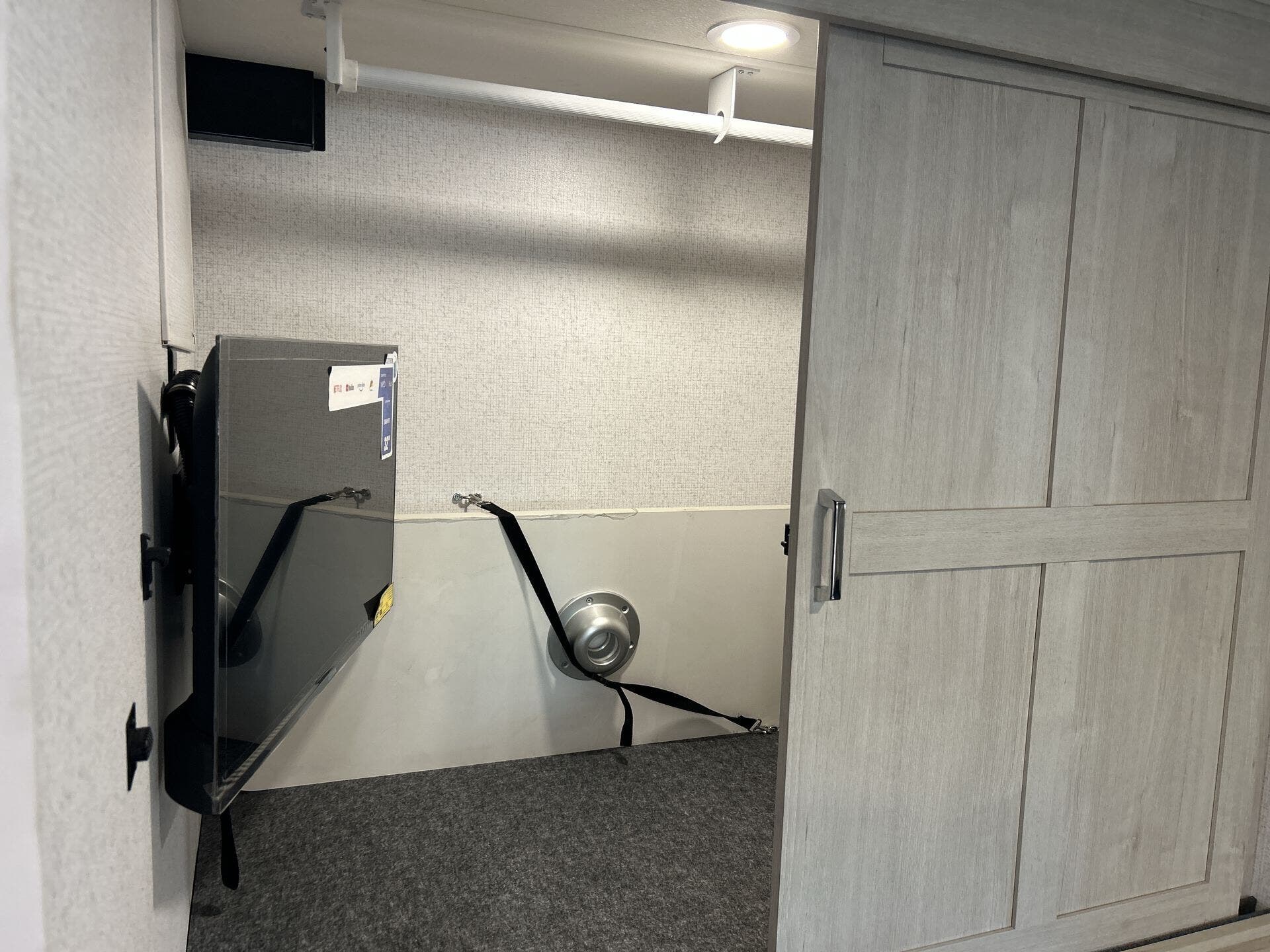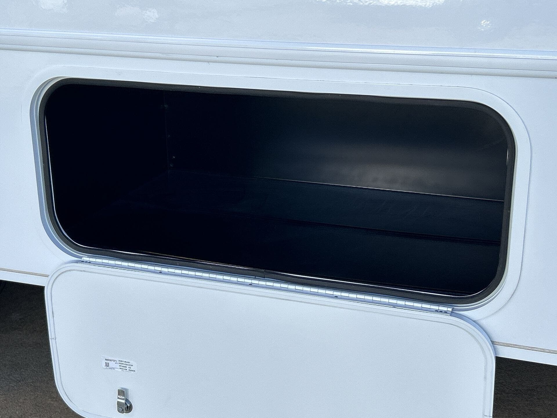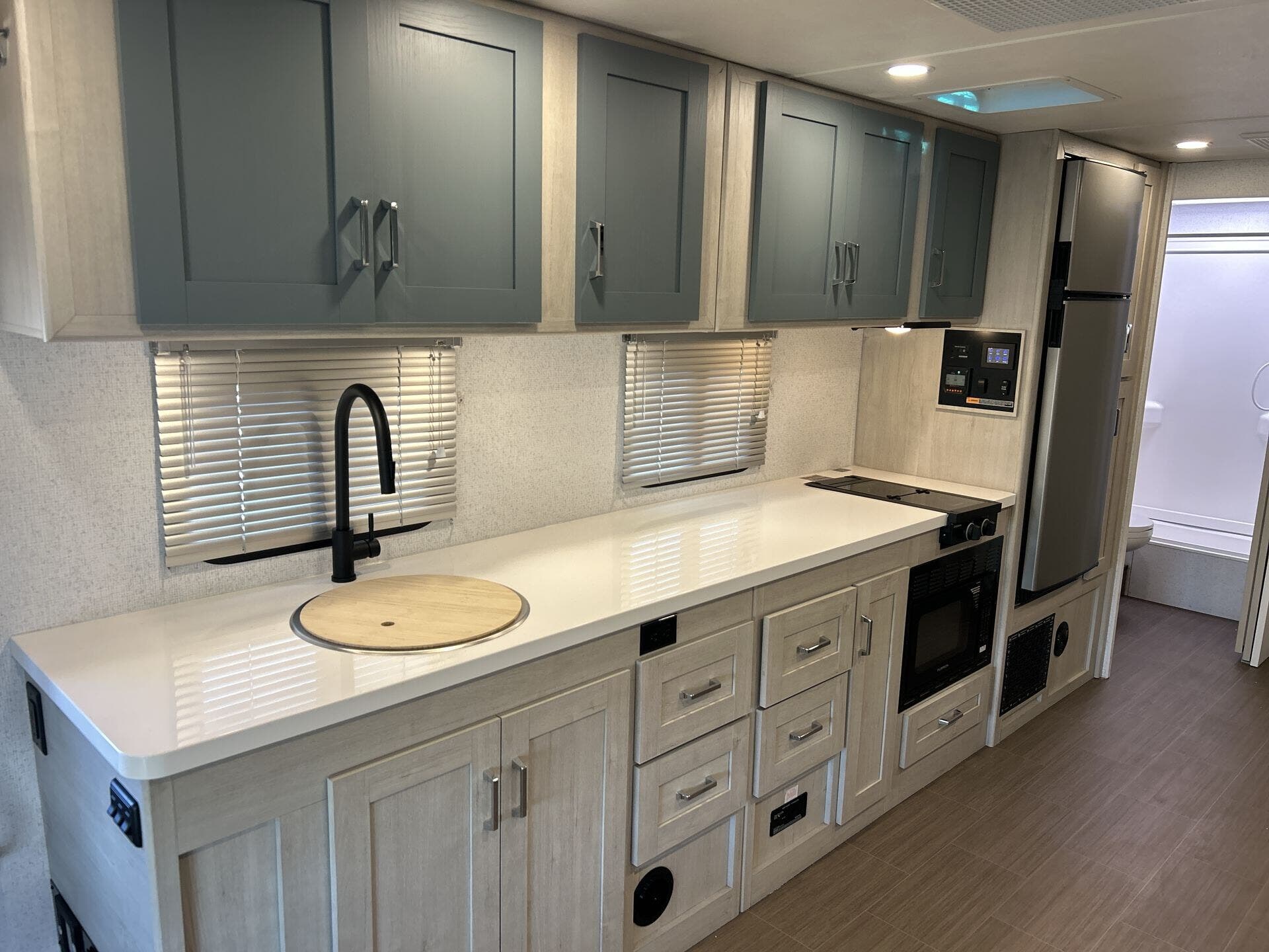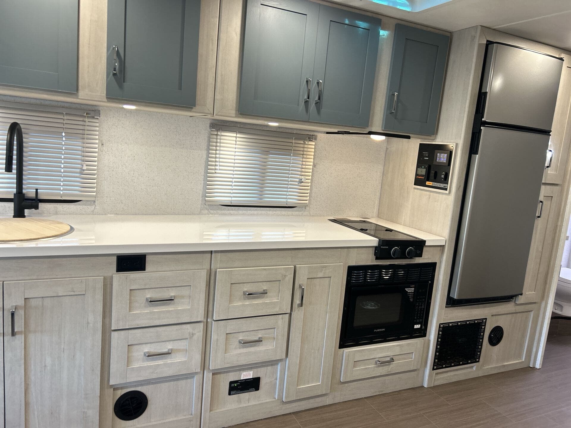 The Sunflyer’s thoughtful layout features a front living area that transitions smoothly into a functional mid kitchen, then flows to a private rear bedroom and bath. The 28MB floorplan includes one slideout to enlarge the living area, enhancing lounge space, dining options, and movement throughout the cab and rear sections. Bunk beds provide flexible sleeping arrangements for kids or additional guests, while a medicine cabinet and roof vents add practicality and comfort to everyday use. A TV and an exterior awning further elevate the home-on-the-road experience for entertaining and outdoor enjoyment.