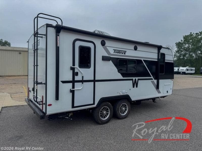 With any Thrive travel trailer by Winnebago, you can camp with functionality, comfort, and convenience! The tinted and frameless front window will be the first thing that catches your eye, and the fiberglass sidewalls with Azdel Onboard provide a durable trailer made to last. There is also an exterior ladder, along with front radius profile lights, power stabilizer jacks, and a powered awning with LED lighting to name a few exterior features. You will stay powered up by the 30-amp power cord and 200-watt solar panel, plus there is a tankless water heater for endless hot showers. Inside, you'll love the custom Winnebago furniture, carpetless side outs, molded fiberglass countertops, and residential recessed ceiling lights to keep your space well lit!