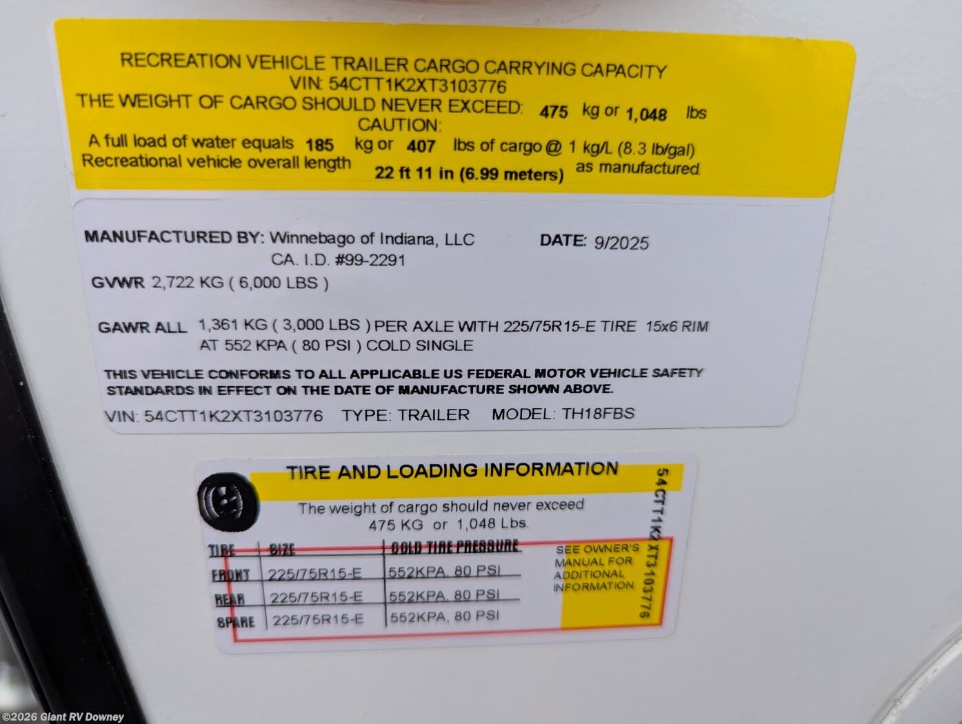 Request More Info on this 2026 Winnebago Thrive 18FBS Offered for sale by Giant RV