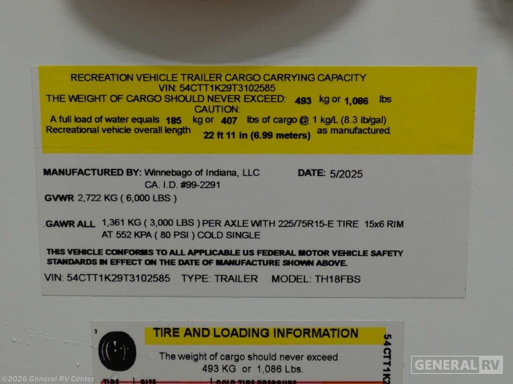 2026 Winnebago Thrive 18FBS Specifications
