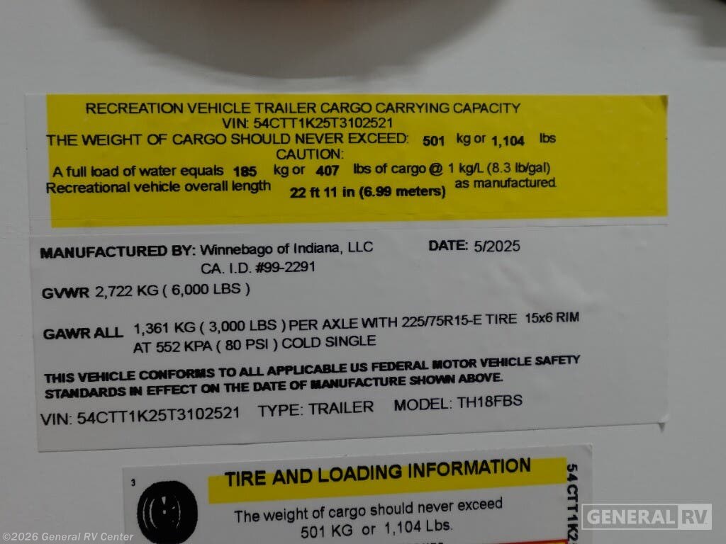 2026 Winnebago Thrive 18FBS Specifications