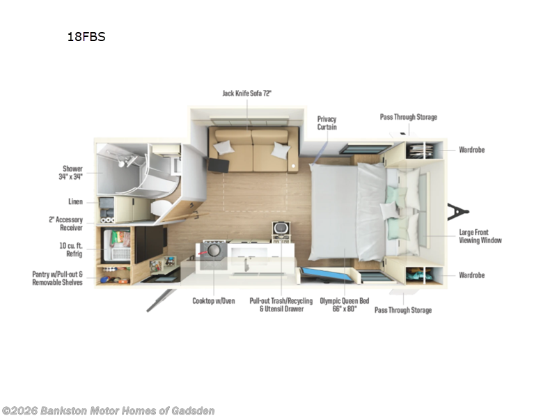 It will be so easy to enjoy camping trips in this compact travel trailer. The jack knife sofa slide provides more floor space plus a place for an overnight guest to sleep. You'll find an Olympic queen bed up front with a privacy curtain and dual bedroom wardrobes to keep your things tidy. A recessed three burner cooktop with an oven will let you make meals each day, and the 10.6 cu. ft. 12V refrigerator will keep your cold items fresh. There is also a pantry with pull-out shelves for added storage space. The full bath includes a power vent fan and a shower skylight that will give you more lighting and extra head room as you get ready each day!