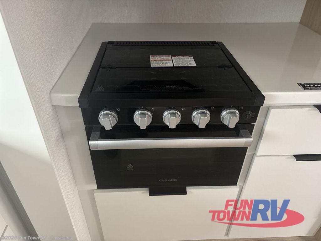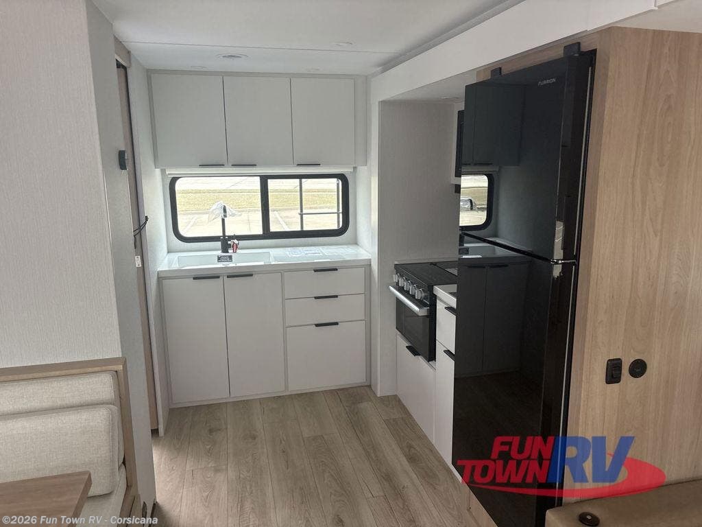 Have everything you need in a compact and well-equipped travel trailer. In the main area there is a large 42" x 82" U-shaped dinette with plenty of room to enjoy a meal, games or sharing stories. Across there is theater seating located in the slide-out that adds extra comfort and seating space. You can enjoy cooking every day from a quick pancake to your favorite casserole in the cooktop with oven and store leftovers in the 10.6 cu. ft. refrigerator. Moving forward you'll find convenient storage options such as the pantry with removable shelves. In the front you'll find a spacious 66" x 80" Olympic queen bed, on each side wardrobes for more storage.