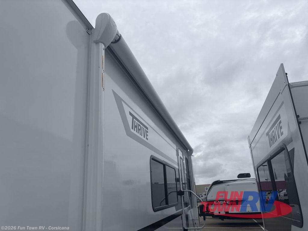 With any Thrive travel trailer by Winnebago, you can camp with functionality, comfort, and convenience! The large front viewing window with strike guard will be the first thing that catches your eye, and the fiberglass sidewalls with Azdel Onboard provide a durable trailer made to last. There is also an exterior ladder, along with front radius profile lights, power stabilizer jacks, and a powered awning with LED lighting to name a few exterior features. You will stay powered up by the 30-amp power cord and 200-watt solar panel, plus there is a tankless water heater for endless hot showers. Inside, you'll love the custom Winnebago furniture, carpetless side outs, molded fiberglass countertops, and residential recessed ceiling lights to keep your space well lit!