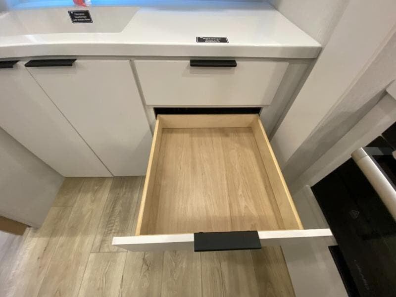 Have everything you need in a compact and well-equipped travel trailer. In the main area there is a large 42" x 82" U-shaped dinette with plenty of room to enjoy a meal, games or sharing stories. Across there is theater seating located in the slide-out that adds extra comfort and seating space. You can enjoy cooking every day from a quick pancake to your favorite casserole in the cooktop with oven and store leftovers in the 10.6 cu. ft. refrigerator. Moving forward you'll find convenient storage options such as the pantry with removable shelves. In the front you'll find a spacious 66" x 80" Olympic queen bed, on each side wardrobes for more storage.