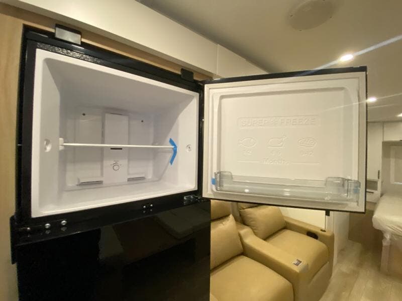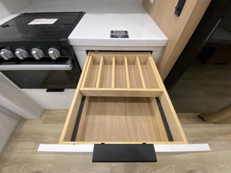 Have everything you need in a compact and well-equipped travel trailer. In the main area there is a large 42" x 82" U-shaped dinette with plenty of room to enjoy a meal, games or sharing stories. Across there is theater seating located in the slide-out that adds extra comfort and seating space. You can enjoy cooking every day from a quick pancake to your favorite casserole in the cooktop with oven and store leftovers in the 10.6 cu. ft. refrigerator. Moving forward you'll find convenient storage options such as the pantry with removable shelves. In the front you'll find a spacious 66" x 80" Olympic queen bed, on each side wardrobes for more storage.