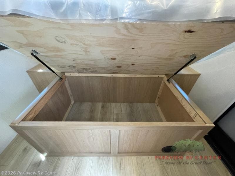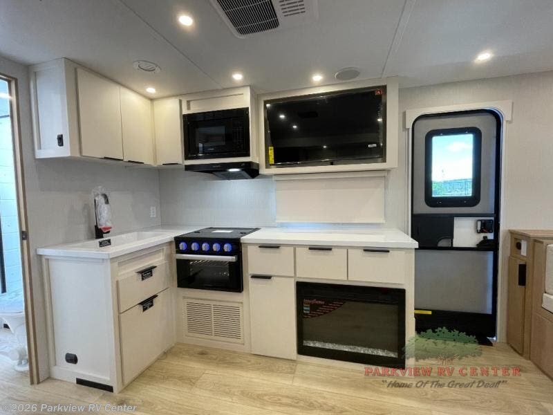 The rear living space of this travel trailer offers a spacious and welcoming layout, perfect for relaxing or entertaining after a day of adventure. In the main area there is a large 42" x 86" U-shaped dinette with plenty of room for meals, games or gathering to share stories. Beside there is theater seating located in the slide-out that adds extra comfort and seating space. Across, a cozy fireplace and TV making this the ideal spot for winding down in the evenings. The kitchen and appliances allow the chef to easily move around in the spacious living area. Moving forward, a pass-through bathroom adds convenience and privacy, leading to the front private bedroom. Here you'll find a spacious 66" x 80" Olympic Queen Bed, on each side wardrobes for ample storage. The bedroom also features a second exterior entry door, providing easy access without disturbing the main living area.