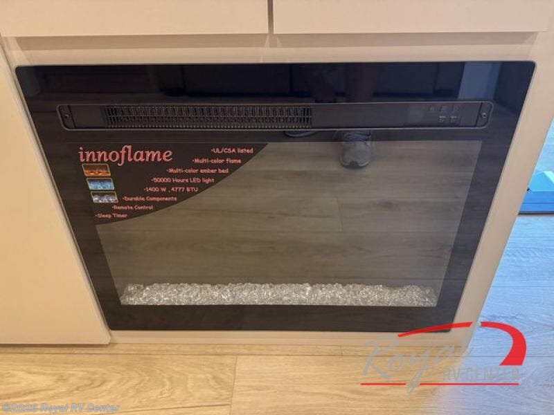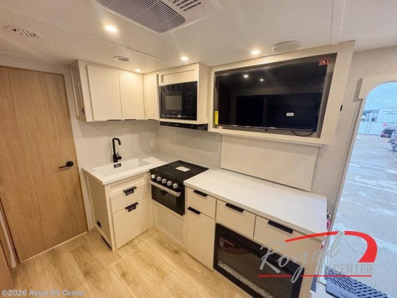 The rear living space of this travel trailer offers a spacious and welcoming layout, perfect for relaxing or entertaining after a day of adventure. In the main area three is a large 42" x 86" U-shaped dinette, with plenty of room for meals, games or gathering to share stories. Beside there is theater seating located in the slide-out that adds extra comfort and seating space. Across, a cozy fireplace and TV making this the ideal spot for winding down in the evenings. The kitchen and appliances allow the chef to easily move around in the spacious living area. Moving forward, a pass-through bathroom adds convenience and privacy, leading to the front private bedroom. Here you'll find a spacious 66" x 80" Olympic Queen Bed, on each side wardrobes for ample storage. The bedroom also features a second exterior entry door, providing easy access without disturbing the main living area.