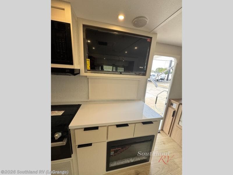The rear living space of this travel trailer offers a spacious and welcoming layout, perfect for relaxing or entertaining after a day of adventure. In the main area three is a large 42" x 86" U-shaped dinette, with plenty of room for meals, games or gathering to share stories. Beside there is theater seating located in the slide-out that adds extra comfort and seating space. Across, a cozy fireplace and TV making this the ideal spot for winding down in the evenings. The kitchen and appliances allow the chef to easily move around in the spacious living area. Moving forward, a pass-through bathroom adds convenience and privacy, leading to the front private bedroom. Here you'll find a spacious 66" x 80" Olympic Queen Bed, on each side wardrobes for ample storage. The bedroom also features a second exterior entry door, providing easy access without disturbing the main living area.