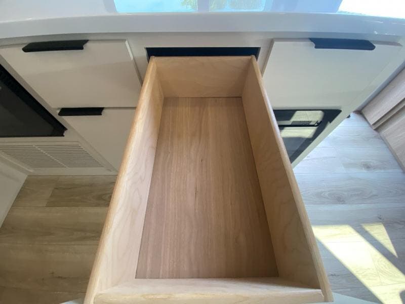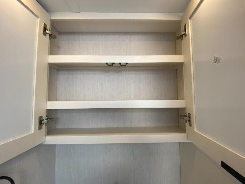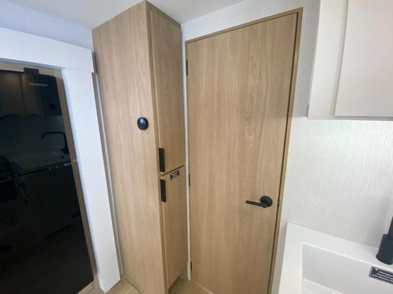 The rear living space of this travel trailer offers a spacious and welcoming layout, perfect for relaxing or entertaining after a day of adventure. In the main area three is a large 42" x 86" U-shaped dinette, with plenty of room for meals, games or gathering to share stories. Beside there is theater seating located in the slide-out that adds extra comfort and seating space. Across, a cozy fireplace and TV making this the ideal spot for winding down in the evenings. The kitchen and appliances allow the chef to easily move around in the spacious living area. Moving forward, a pass-through bathroom adds convenience and privacy, leading to the front private bedroom. Here you'll find a spacious 66" x 80" Olympic Queen Bed, on each side wardrobes for ample storage. The bedroom also features a second exterior entry door, providing easy access without disturbing the main living area.