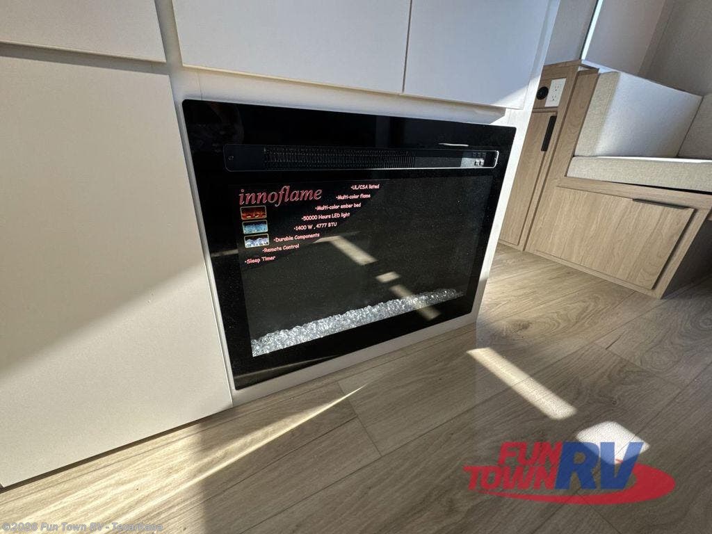 The rear living space of this travel trailer offers a spacious and welcoming layout, perfect for relaxing or entertaining after a day of adventure. In the main area three is a large 42" x 86" U-shaped dinette, with plenty of room for meals, games or gathering to share stories. Beside there is theater seating located in the slide-out that adds extra comfort and seating space. Across, a cozy fireplace and TV making this the ideal spot for winding down in the evenings. The kitchen and appliances allow the chef to easily move around in the spacious living area. Moving forward, a pass-through bathroom adds convenience and privacy, leading to the front private bedroom. Here you'll find a spacious 66" x 80" Olympic Queen Bed, on each side wardrobes for ample storage. The bedroom also features a second exterior entry door, providing easy access without disturbing the main living area.