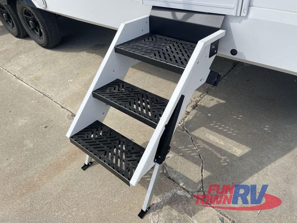 With any Thrive travel trailer by Winnebago, you can camp with functionality, comfort, and convenience! The large front viewing window with strike guard will be the first thing that catches your eye, and the fiberglass sidewalls with Azdel Onboard provide a durable trailer made to last. There is also an exterior ladder, along with front radius profile lights, power stabilizer jacks, and a powered awning with LED lighting to name a few exterior features. You will stay powered up by the 30-amp power cord and 200-watt solar panel, plus there is a tankless water heater for endless hot showers. Inside, you'll love the custom Winnebago furniture, carpetless side outs, molded fiberglass countertops, and residential recessed ceiling lights to keep your space well lit!