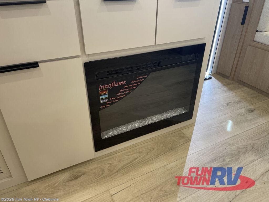 The rear living space of this travel trailer offers a spacious and welcoming layout, perfect for relaxing or entertaining after a day of adventure. In the main area three is a large 42" x 86" U-shaped dinette, with plenty of room for meals, games or gathering to share stories. Beside there is theater seating located in the slide-out that adds extra comfort and seating space. Across, a cozy fireplace and TV making this the ideal spot for winding down in the evenings. The kitchen and appliances allow the chef to easily move around in the spacious living area. Moving forward, a pass-through bathroom adds convenience and privacy, leading to the front private bedroom. Here you'll find a spacious 66" x 80" Olympic Queen Bed, on each side wardrobes for ample storage. The bedroom also features a second exterior entry door, providing easy access without disturbing the main living area.