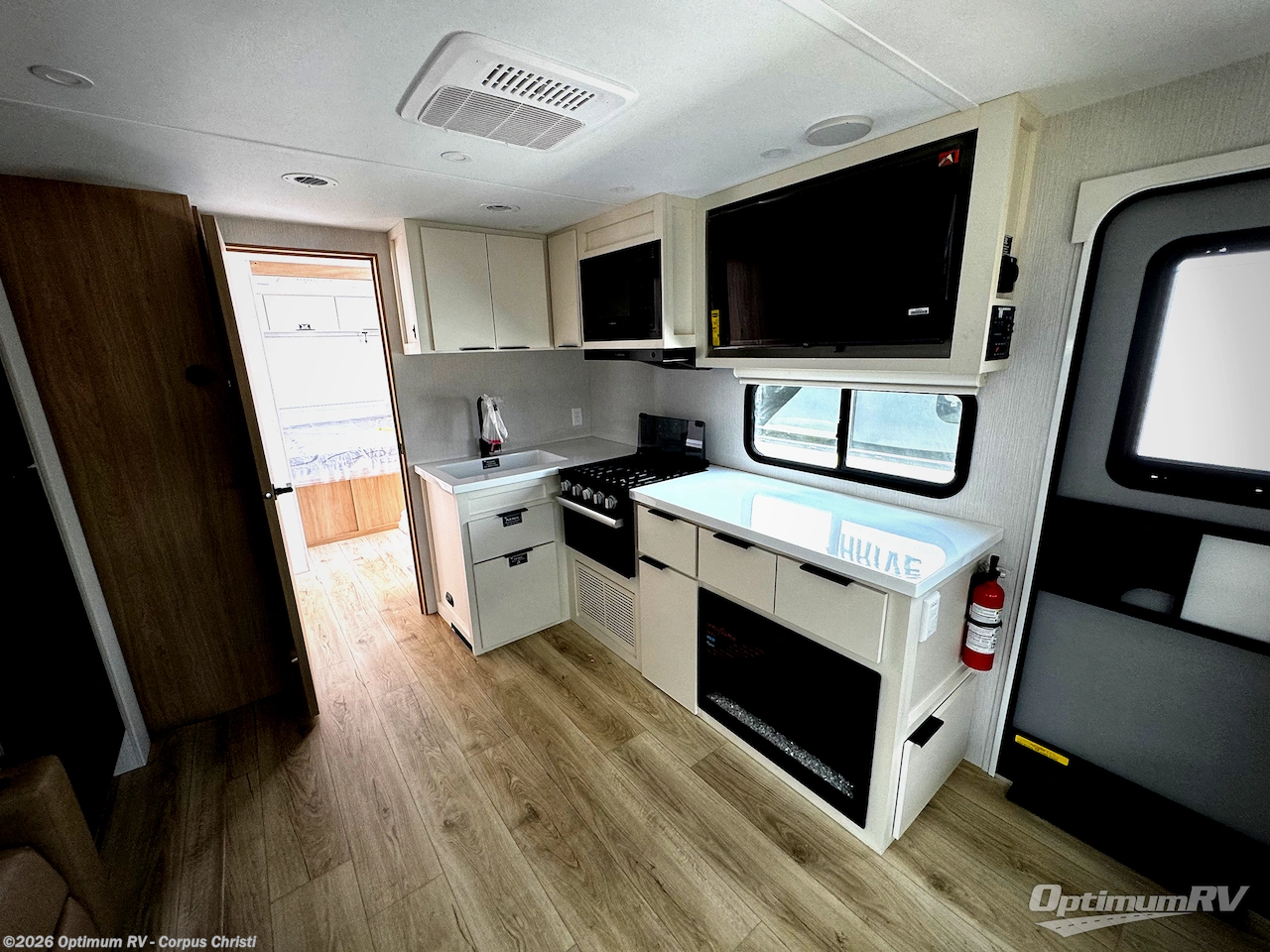 The rear living space of this travel trailer offers a spacious and welcoming layout, perfect for relaxing or entertaining after a day of adventure. In the main area there is a large 42" x 86" U-shaped dinette with plenty of room for meals, games or gathering to share stories. Beside there is theater seating located in the slide-out that adds extra comfort and seating space. Across, a cozy fireplace and TV making this the ideal spot for winding down in the evenings. The kitchen and appliances allow the chef to easily move around in the spacious living area. Moving forward, a pass-through bathroom adds convenience and privacy, leading to the front private bedroom. Here you'll find a spacious 66" x 80" Olympic Queen Bed, on each side wardrobes for ample storage. The bedroom also features a second exterior entry door, providing easy access without disturbing the main living area.